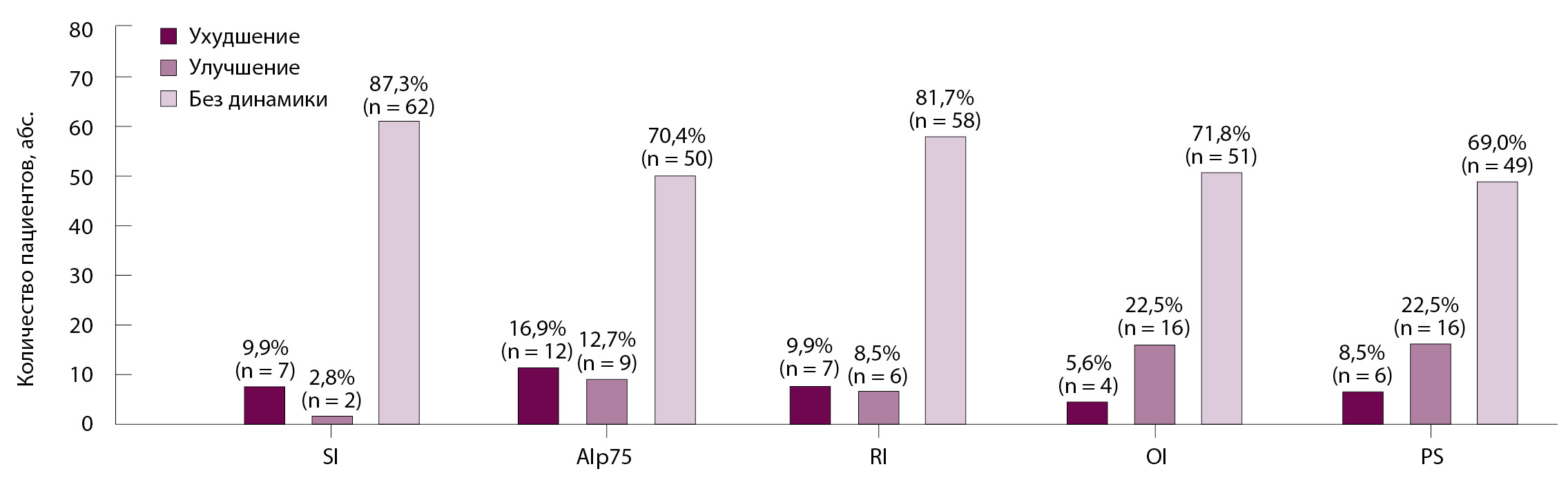 Анализ индивидуальных данных показал, что после проведения ВДХТ с аутоТГСК изменения показателей артериальной функции были разнонаправлены (рис. 2). После ВДХТ и аутоТГСК у некоторых пациентов происходило ухудшение показателей артериальной функции. Так, увеличение (ухудшение) SI отмечено у 7 (9,8%) пациентов, AIp75 – у 12 (16,9%), RI – у 7 (9,8%), снижение (ухудшение) OI – у 4 (5,6%) пациентов и PS – у 6 (7%). В то же время у небольшого числа пациентов улучшались показатели SI (n = 2; 2,8%), RI (n = 6; 8,4%), AIp75 (n = 9; 12,7%), у несколько большего количества больных улучшались показатели OI (n = 16; 22,5%) и PS (n = 16; 22,5%).