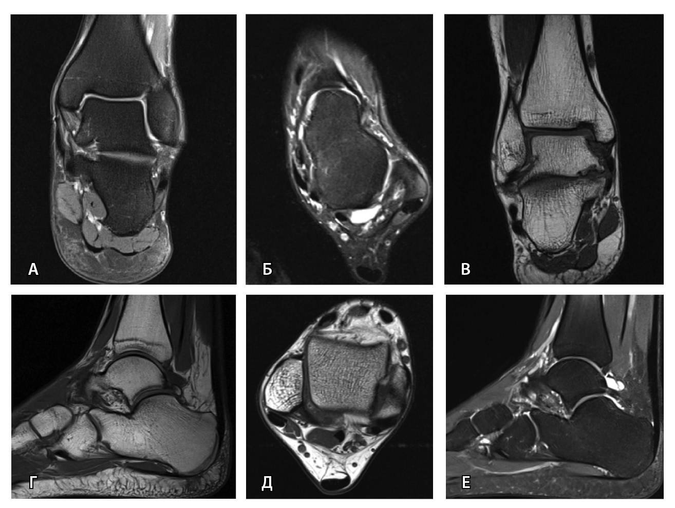Рис. 5. Стандартный протокол магнитно-резонансной томографии голеностопного сустава согласно рекомендациям ESSR (2016): А – COR FS, Б – AX FS, В – COR T1, Г – SAG T1, Д – AX PD, Е – SAG STIR; AX – аксиальная, COR – корональная, FS – жироподавление, PD – протонная плотность, SAG – сагиттальная, STIR – инверсия-восстановление спинового эха
