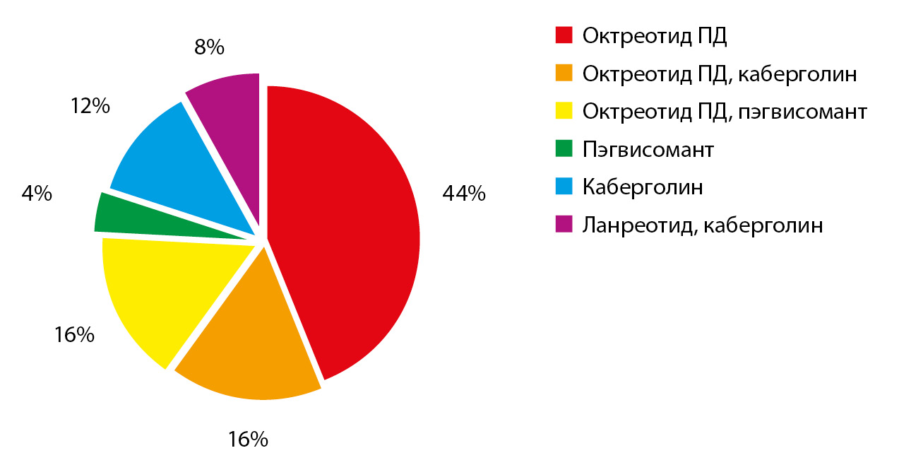 Медикаментозная терапия в лечении акромегалии применяется у 25/59 (42,37%) пациентов (рис. 2). У 10/59 (16,95%) пациентов медикаментозное лечение используется как терапия первой линии в связи с отказом от нейрохирургического лечения, из них у 4 человек достигнута ремиссия.
