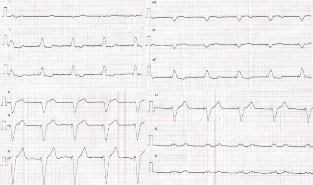 Рис. 1. Электрокардиограмма до операции. Постоянная желудочковая стимуляция в однокамерном режиме VVI(R) с базовой частотой 65 ударов в минуту. Длительность QRS 180 мс