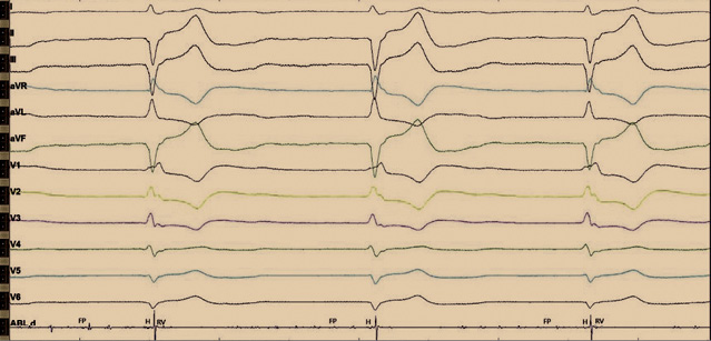 Рис. 2. Интраоперационное изображение с электрофизиологического монитора во время отключения электрокардиостимулятора. Отмечается нарушение внутрижелудочкового проведения по типу блокады правой ножки пучка Гиса и блокады передней ветви левой ножки пучка Гиса. Регистрируются эндограммы c аблационного катетера: фибрилляции предсердий (FP), проводящей системы (H) и высокоамплитудные желудочковые эндограммы (RV). На данном рисунке эндограммы H и FP трудно различимы между собой, однако стимуляция с картирующего электрода данной области позволяла получить стимуляционный комплекс, идентичный с нативным. Более выраженную эндограмму пучка Гиса зафиксировать не удалось. Предположительно, это связано с ранее проведенной аблацией атриовентрикулярного соединения