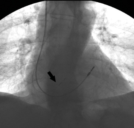Рис. 3. Рентгенограмма после имплантации. Отражено два электрода: прежний, установленный в выходном тракте правого желудочка, и новый, имплантированный в область пучка Гиса (указан стрелкой)