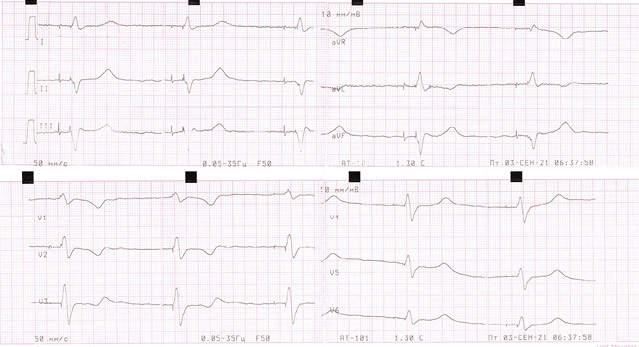Пациент 67 лет поступил в отделение нарушения ритма сердца с диагнозом «истощение ЭКС, имплантация Talos SR от 2011 г. Ишемическая болезнь сердца, стабильная стенокардия напряжения, постинфарктный кардиосклероз, стентирование правой коронарной артерии от 2011 г. Артифициальная атриовентрикулярная блокада 3-й степени, постоянная эндокардиальная желудочковая стимуляция. Постоянная форма ФП. Сердечная недостаточность I стадии по Василенко – Стражеско, II функциональный класс по NYHA (New York Heart Association Functional Classification – Функциональная классификация Нью-Йоркской кардиологической ассоциации). Умеренная митральная недостаточность. Гипертоническая болезнь III стадии, очень высокого риска. Хроническая болезнь почек С2 (скорость клубочковой фильтрации 61 мл/мин/1‚73 м2), креатинин в крови 79 мл/мин». При поступлении предъявлял жалобы на ноющую боль с локализацией в левой половине грудной клетки, возникающую при физической нагрузке и купирующуюся самостоятельно; одышку при физической нагрузке при подъеме выше 2-го этажа, головокружение; повышение артериального давления, максимально до 150 мм рт. ст. В течение жизни длительно страдает гипертонической болезнью. Клиника ишемической болезни сердца с 2009 г. В 2011 г. на коронароангиографии выявлено стенозирующее поражение правой коронарной артерии в виде стеноза средней трети 75%. Проведена транслюминальная баллонная ангиопластика и стентирование правой коронарной артерии. Инфаркт миокарда неизвестной давности. В 2011 г. на фоне симптомной медикаментознорезистентной тахи-брадиформы ФП и синкопальных состояний выполнена операция – радиочастотная аблация атриовентрикулярного соединения. Первичная имплантация однокамерного ЭКС (Talos SR), постоянная эндокардиальная желудочковая стимуляция в режиме VVI(R). При последнем плановом программировании ЭКС выявлены признаки истощения батареи.