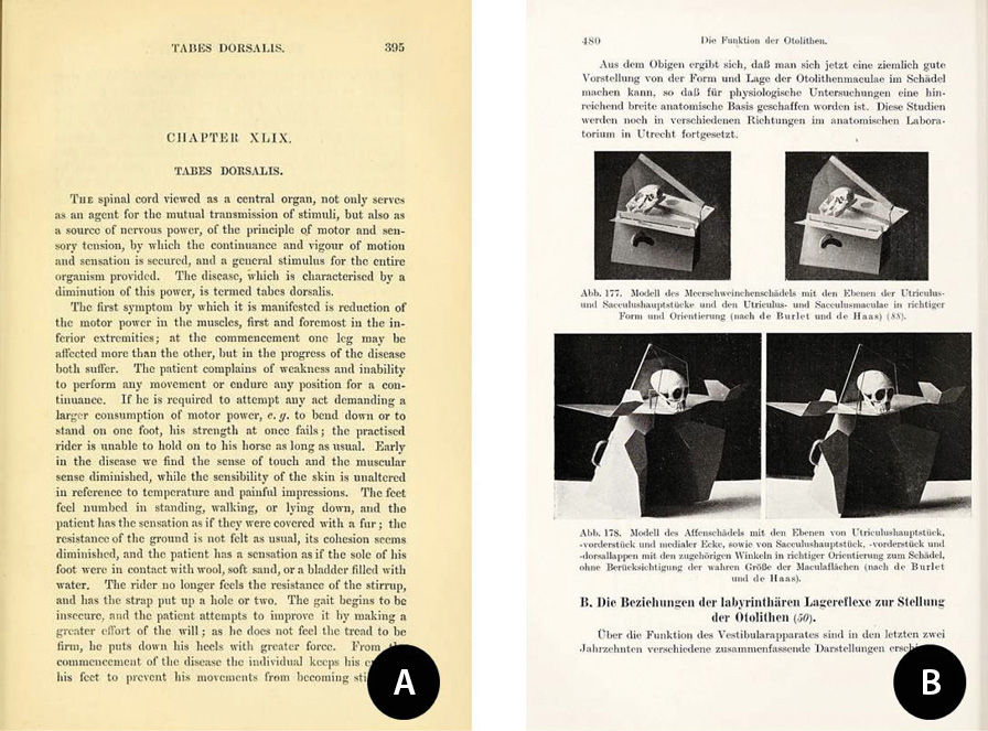 Сегодня существуют различные варианты выполнения теста Ромберга. Их «привязка» к конкретной задаче может иногда затенять первоначальную простую интерпретацию результата теста – «положительный» или «отрицательный» [9], то есть ответ на вопрос, падает ли пациент при ходьбе в темноте. Мориц Ромберг (Moritz Heinrich Romberg) в своем руководстве по неврологии (здесь цитируется по более позднему (1853) английскому переводу [10], с. 395) писал, что у пациента с потерей проприоцептивной чувствительности вследствие tabes dorsalis (спинная сухотка), когда ноги пациента «будто покрыты мехом», неустойчивость, ненадежность походки сразу проявляются при закрывании глаз. На рис. 1 приведены страницы из классических работ [10, 11]. Термин «тест Ромберга» в его сегодняшнем понимании как пробы на устойчивость человека в вертикальной позе при закрывании глаз появляется позже [12].