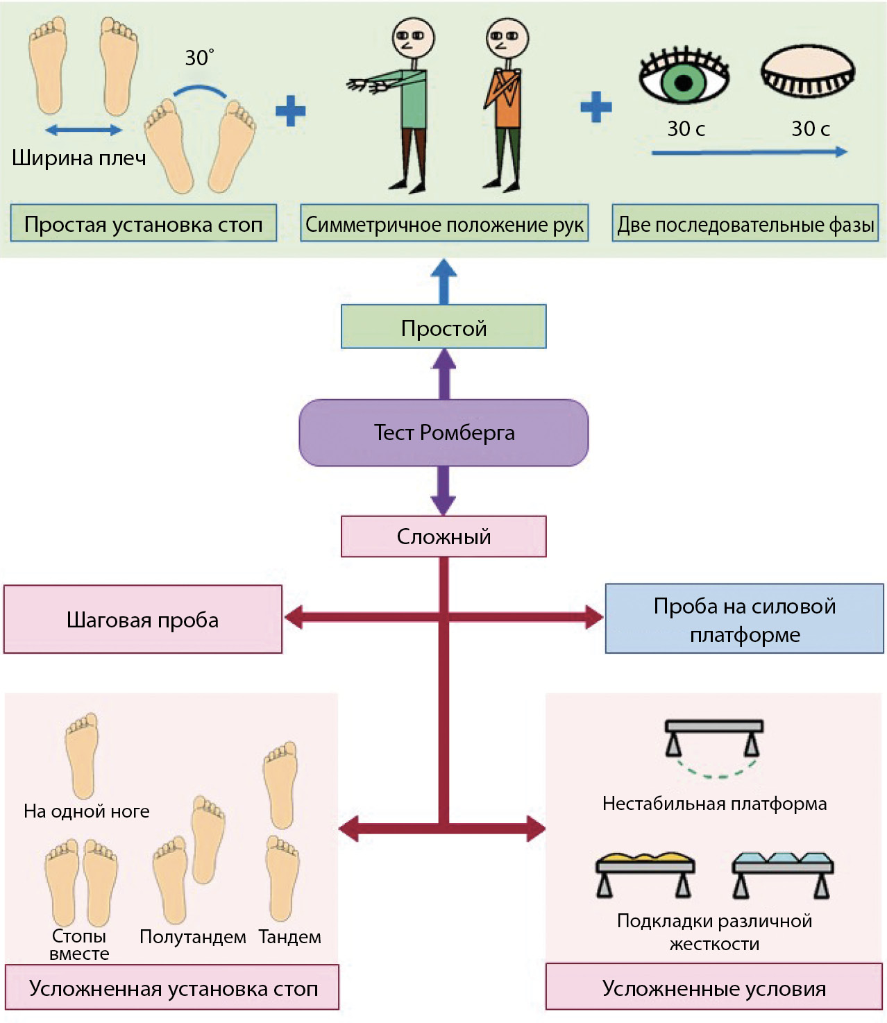 Многочисленные варианты пробы Ромберга условно можно разделить на две группы: простые и усложненные (или модифицированные, в английском эквиваленте – modified/sharpened). Простая проба Ромберга представляет собой спокойное стояние на неподвижной платформе в течение 1 минуты (первые 30 секунд человек стоит с открытыми глазами, затем закрывает их), при этом стопы и руки находятся в одном из стандартных положений. Модифицированная проба является дополненной простой. Чаще всего такую модификацию можно свести к двум направлениям. Первое предполагает использование усложненных позиций стоп на протяжении всего исследования либо чередование разных позиций [33]. Другое направление – изменение поверхности, на которой стоит испытуемый. Например, применение нестабильных платформ, подкладок различной жесткости, специальных подушек [34]. Назначение таких проб – дифференцированная оценка стабильности вертикальной позы без применения специальных измерительных приборов, при которой создаются условия для уменьшения или увеличения влияния проприоцепции [35]. К усложненным можно также отнести шаговую пробу [36]. В другой тип выделяют тесты, проводимые уже с применением силовой платформы [37]. Упрощенная схема распространенных вариантов пробы Ромберга дана на рис. 2.