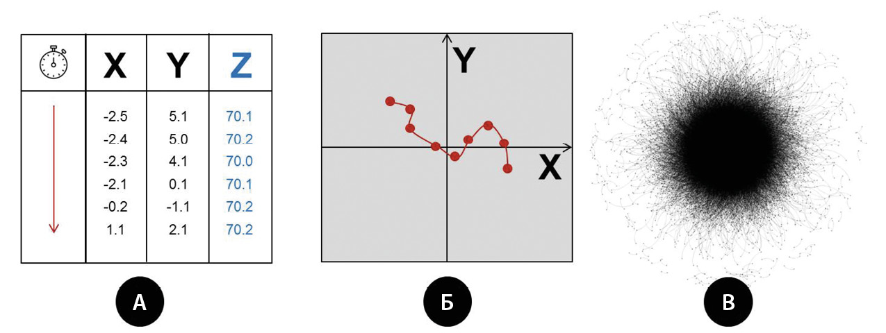 Рис. 3. Происхождение и использование данных о координатах центра давления. Условный фрагмент последовательного определения координат центра давления испытуемого на опору (A); условный график последовательных положений координат X, Y – статокинезиограмма (Б); граф, построенный по реальным данным о координатах X и Y за 30 секунд (В)
