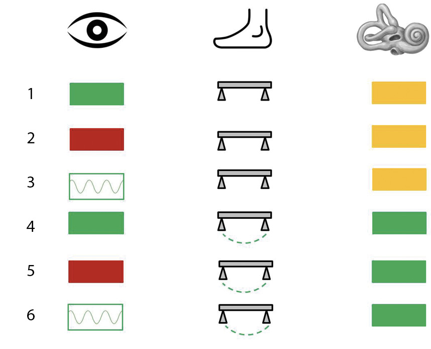 Фактически тест сенсорной организации – это батарея коротких тестов, включающих следующие фазы: 1) спокойное стояние испытуемого на неподвижной опоре с открытыми глазами; 2) спокойное стояние на неподвижной опоре с закрытыми глазами; 3) стояние на неподвижной опоре в условиях нестабильного визуального окружения; 4) стояние испытуемого с открытыми глазами на качающейся опоре; 5) стояние испытуемого с закрытыми глазами на качающейся опоре; 6) стояние испытуемого с открытыми глазами на качающейся опоре в условиях нестабильного визуального окружения. Условная схема подобных тестов отображена на рис. 4. В штатной версии коммерческого теста сенсорной организации каждая фаза длится по 20 секунд и повторяется трижды – как считается, для повышения надежности результата. Сегодня данный комплексный тест широко используется во всем мире, что позволяет условно рассматривать его как эталонный или стандартный. Доступно множество описаний применения и проведения теста сенсорной организации, включая видеоиллюстрации [44].