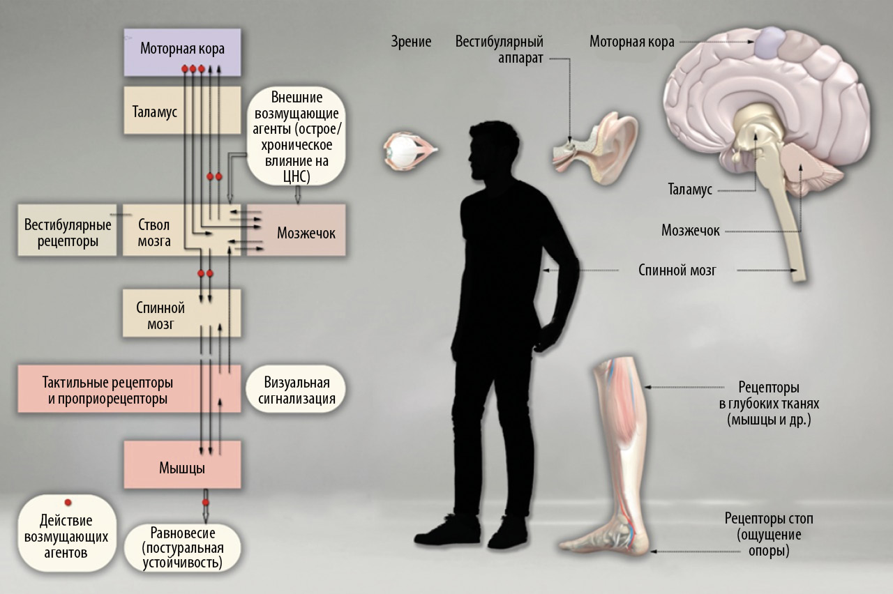 Разрабатываются и другие теории, в частности, большое значение придается интегративной роли центральной нервной системы и базальному мышечному тонусу [57]. Упрощенная схема регуляции вертикальной позы человека представлена на рис. 5, где красным отмечены возможные «точки приложения» возмущающих факторов.