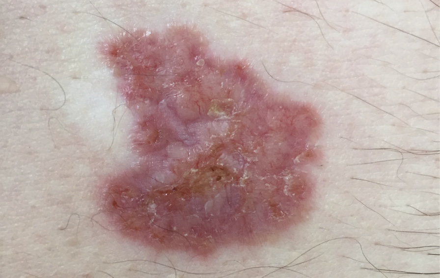 Рис. 1. Болезнь Боуэна: эритематозная бляшка на коже живота с корками и чешуйками на поверхности