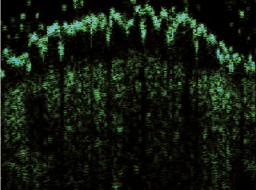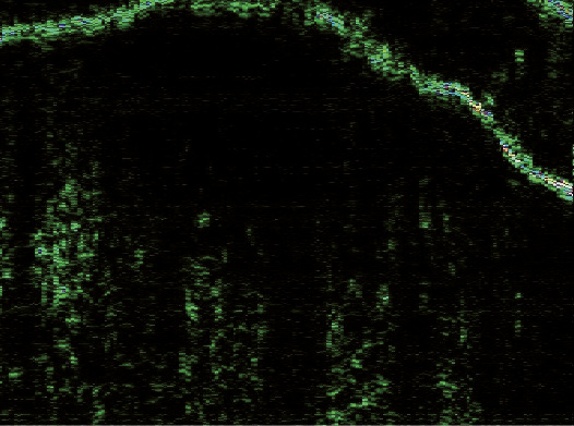 Рис. 3. Сканограмма болезни Боуэна (датчик 75 МГц). Гиперэхогенный эпидермис одинаковой ширины на всем протяжении, с ровным внешним и внутренним контуром (разновидность 2). Гипоэхогенная зона определяется в виде образования округлой формы с нечеткими границами