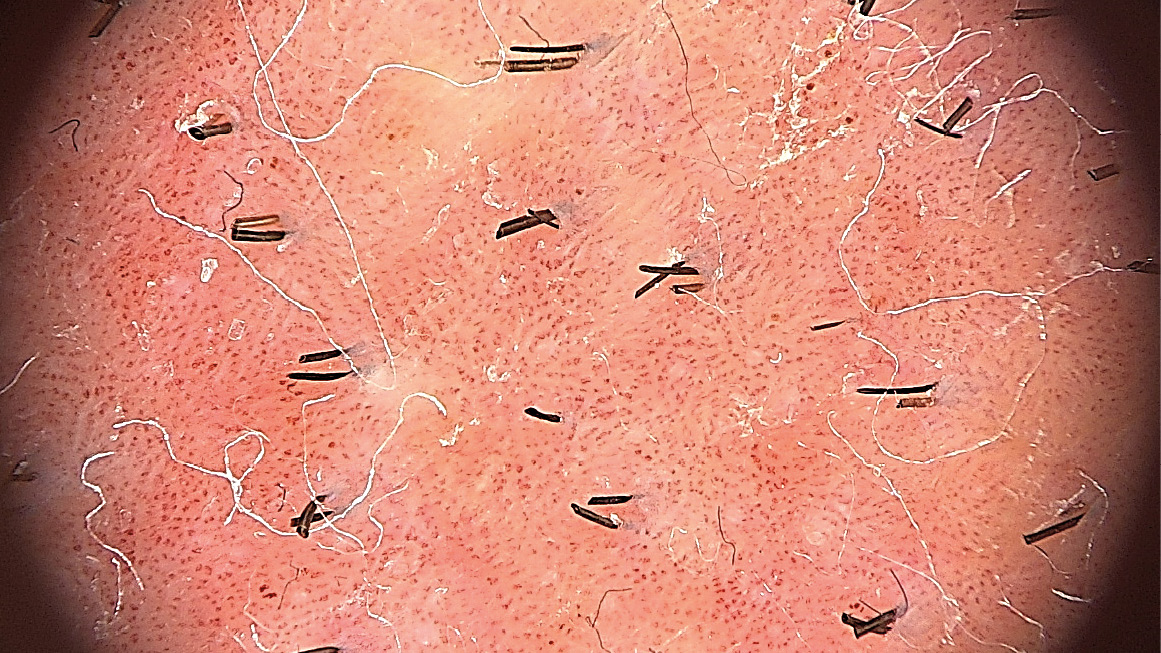 Рис. 1. Дерматоскопическая картина вульгарного псориаза (равномерное распределение точечных сосудов, белые чешуйки расположены диффузно); × 20