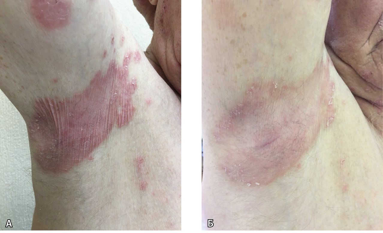 Рис. 4. Больной К., 75 лет: А – псориатические высыпания в аксиллярной складке до лечения; Б – клиническая картина на 2-й день терапии