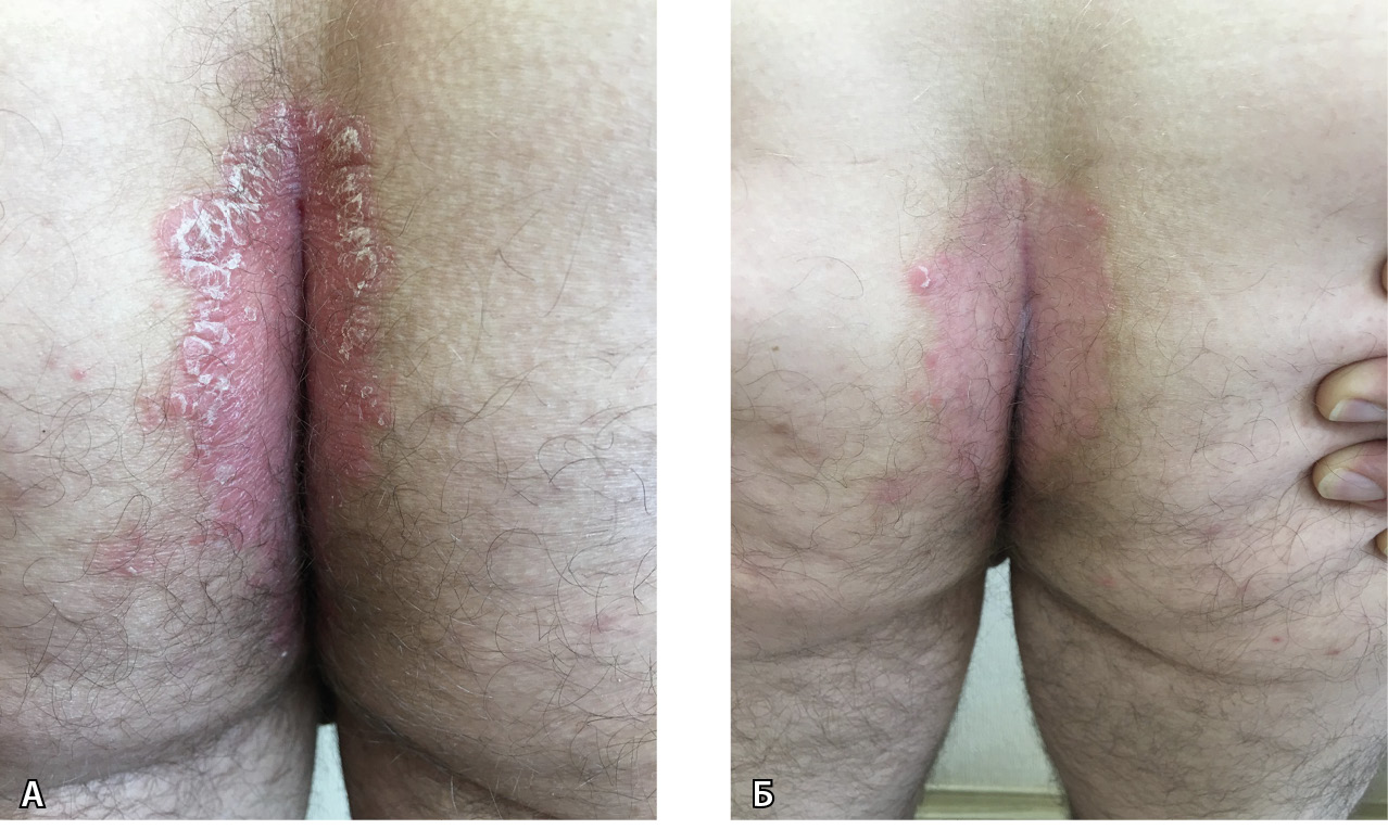 Рис. 5. Больной В., 45 лет: А – псориатические высыпания в межъягодичной складке до лечения; Б – клиническая картина на 7-й день терапии