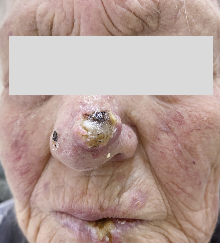 Больная С., 84 года, пенсионерка, консультирована дерматоонкологом ГБУЗ ПК «Краевой клинический кожно-венерологический диспансер». Жалобы при обращении: быстрый рост и боль опухолевидного образования на кончике носа, болезненная язва на нижней губе, образование множественных пятен с плотными корками на лице.