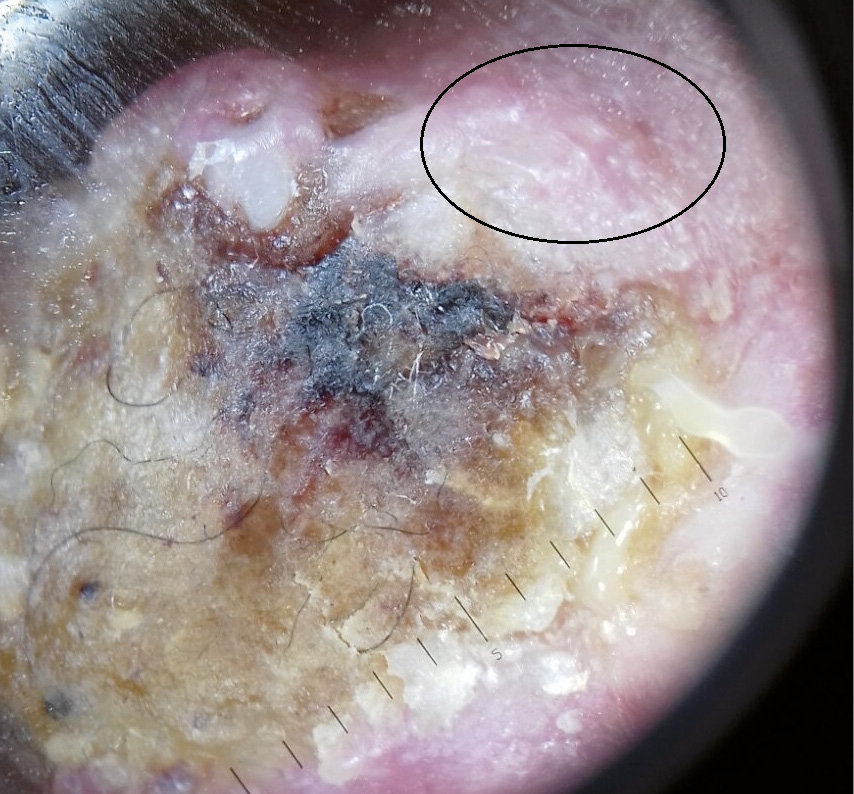 Рис. 5. Дерматоскопия плоскоклеточного рака кожи кончика носа, овалом обозначены белые точки и круги