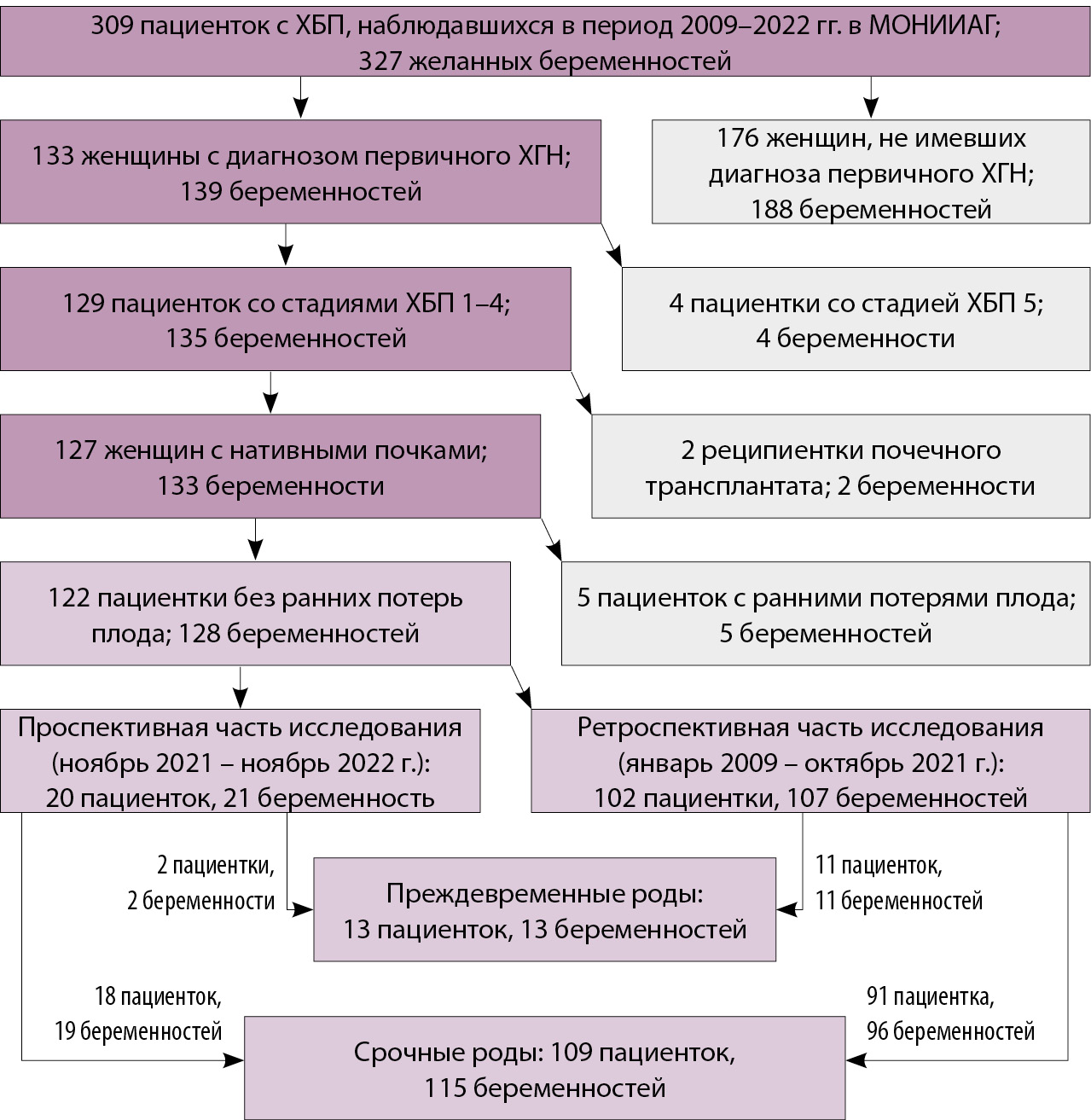 Исследование было наблюдательным поперечным ретроспективно-проспективным. В ретроспективную часть включили пациенток с ХГН, имевших роды в январе 2009 – октябре 2021 г. Анамнестические и клинические данные, информация об исходе беременности у пациенток в ретроспективной части были получены из карт амбулаторного наблюдения, историй родов и историй развития новорожденных. В проспективную группу вошли пациентки с этим же диагнозом, которые наблюдались в связи с беременностью и были родоразрешены в период с ноября 2021 по ноябрь 2022 г. включительно (рис. 1).