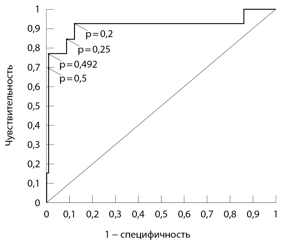 Основываясь на максимальной диагностической эффективности (точности) модели, значение порога активации было выбрано равным 0,492: если значение p, рассчитанное по вышеприведенной формуле, оказывается большим или равным 0,492, предполагается наступление ПР. Чувствительность модели составила 76,9%, специфичность – 99,1%, диагностическая эффективность – 96,9%, положительная предсказательная значимость модели – 90,9%, отрицательная предсказательная значимость – 97,4%.