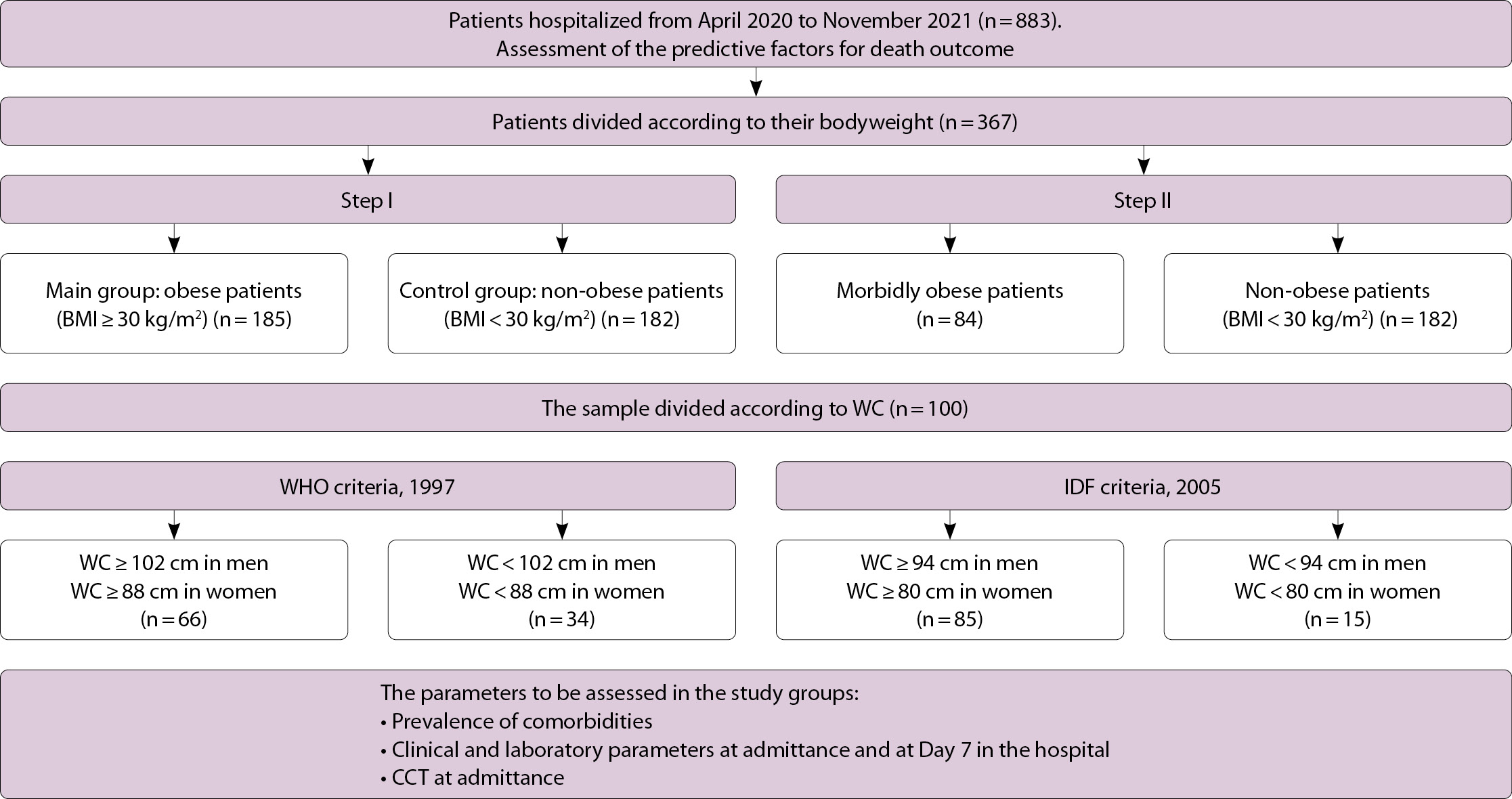 Всего проанализированы 883 участника, у которых верифицированы гипертоническая болезнь (ГБ), хроническая сердечная недостаточность (ХСН), ишемическая болезнь сердца (ИБС), хроническая болезнь почек (ХБП) (скорость клубочковой фильтрации < 60 мл/мин/1,73 м2), онкологические заболевания, болезни органов дыхания и ожирение с ИМТ ≥ 30 без подразделения на степени ожирения, с проведением оценки прогностических факторов риска летального исхода в данной группе. Среди всех участников 382 пациента имели СД 2-го типа, 501 пациент был без СД. Из основной выборки выделены также 367 участников, которые были распределены по классу массы тела в группу с ожирением (ИМТ ≥ 30) – 185 участников и в группу без ожирения (ИМТ < 30) – 182 человека. Дополнительно проводился анализ в группах больных с морбидным ожирением (n = 84) и без ожирения (ИМТ < 30) (n = 182) [12]. Разделение выборки по ОТ на группы осуществлялось согласно критериям Всемирной организации здравоохранения (ВОЗ, 1997) по высокому риску развития метаболических осложнений, связанных с ожирением, а именно: для мужчин ≥ 102 см, для женщин ≥ 88 см [13], а также по критериям Международной федерации диабета (англ. International Diabetes Federation, IDF, 2005): для мужчин ≥ 94 см, для женщин ≥ 80 см [14].