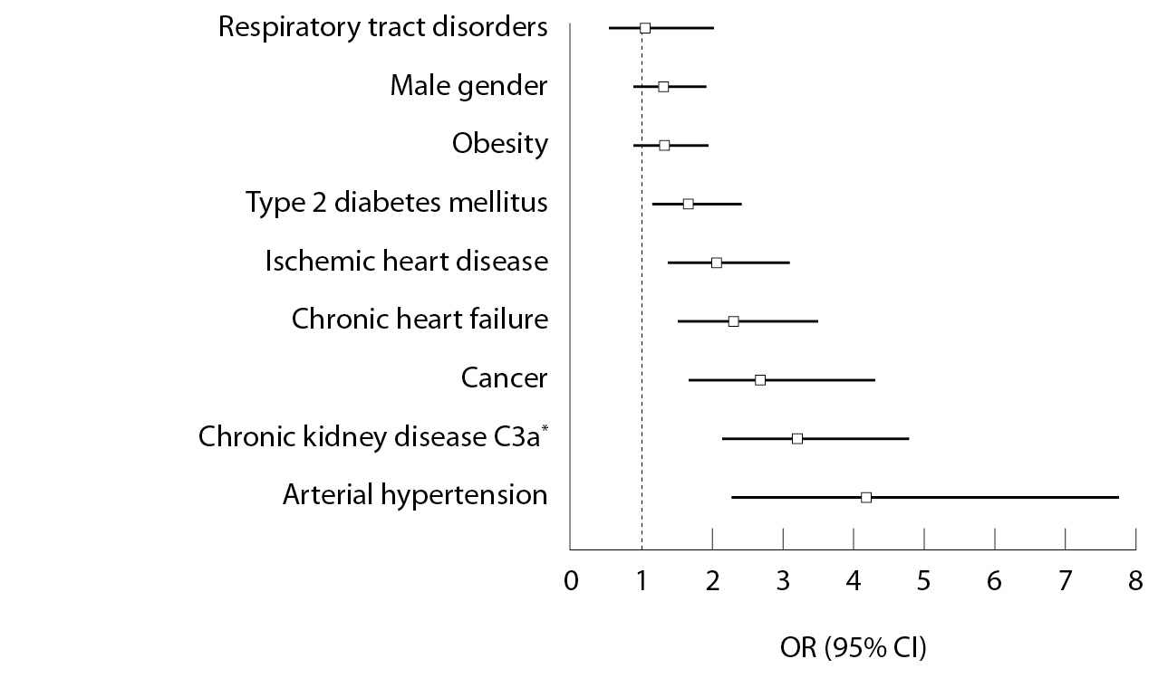 Рис. 2. Влияние сопутствующих заболеваний на риск развития летального исхода при COVID-19; ДИ – доверительный интервал, ОШ – отношение шансов; *скорость клубочковой фильтрации < 60 мл/мин/1,73 м2