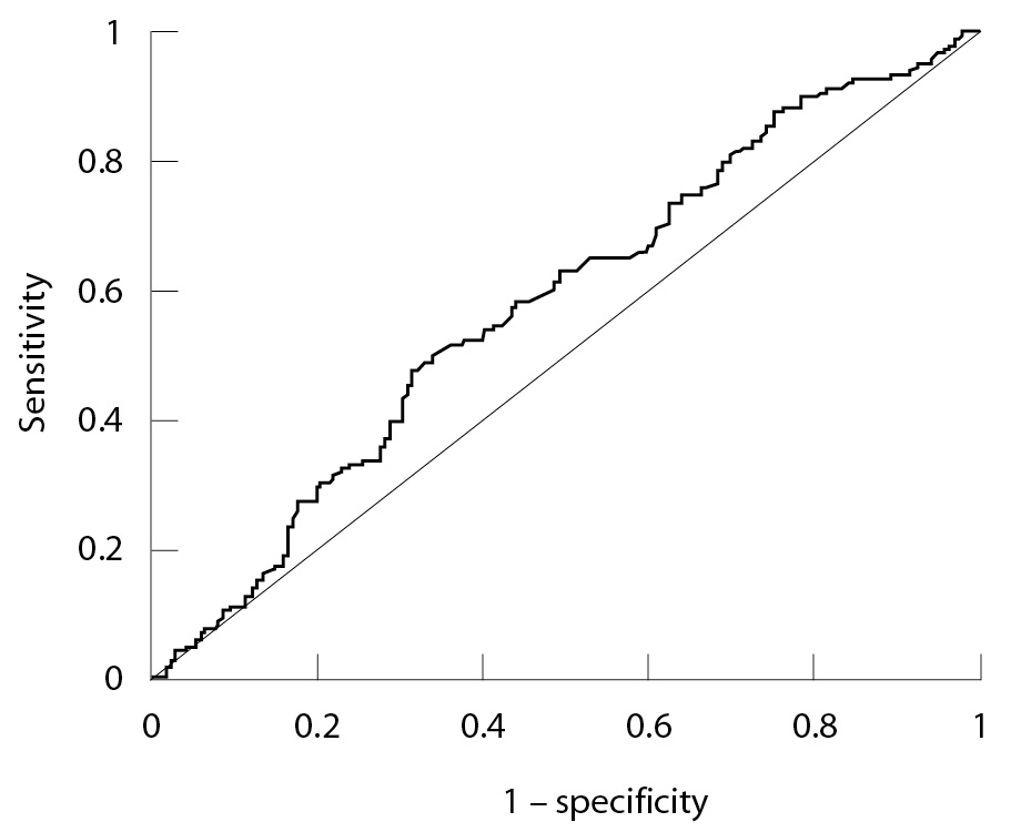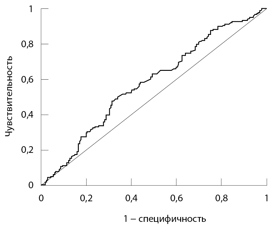 С целью выбора оптимального значения ИМТ, влияющего на прогноз COVID-19, был использован анализ ROC-кривых. Полученная ROC-кривая характеризовалась значением AUC (англ. area under the curve – площадь под кривой) = 0,58 ± 0,03 (95% ДИ 0,52–0,64), модель статистически значима (p = 0,008). Пороговое значение ИМТ, разделяющее пациентов по тяжести течения COVID-19, составляло 29 кг/м2. При ИМТ ≥ 29 прогнозировался высокий риск тяжелого течения коронавирусной инфекции. Однако полученная модель имела низкие показатели чувствительности и специфичности – 63 и 51% соответственно (рис. 3). Следует отметить, что при прогнозировании вероятности перевода в ОРИТ (AUC = 0,515 ± 0,04 (95% ДИ 0,45–0,59), p = 0,677), на ИВЛ (AUC = 0,484 ± 0,04 (95% ДИ 0,40–0,57), p = 0,714), а также смертельного исхода (AUC = 0,520 ± 0,04 (95% ДИ 0,45–0,59), p = 0,607) в зависимости от ИМТ статистически значимых моделей анализа ROC-кривых получено не было. Следовательно, согласно анализу ROC-кривых, при ИМТ ≥ 29,0 прогнозировался высокий риск тяжелого течения коронавирусной инфекции.