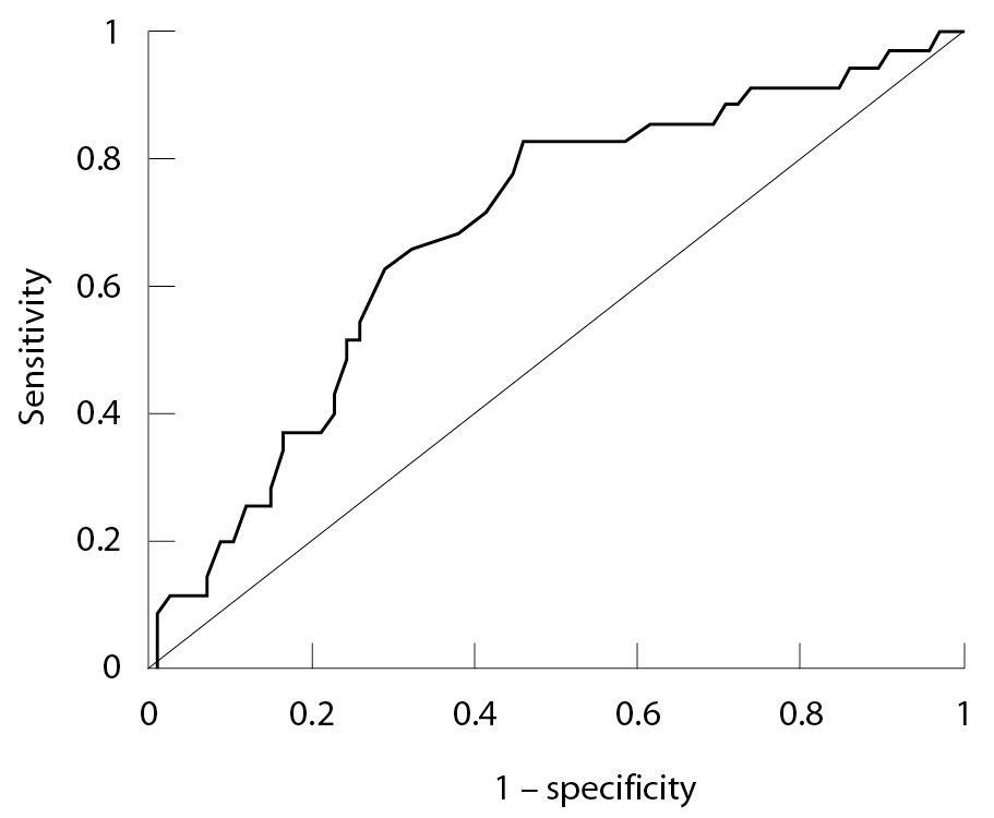 Далее у 100 пациентов был проведен анализ ROC-кривых зависимости вероятности летального исхода от ОТ (см). Данная модель оказалась статистически незначимой (AUC = 0,631 ± 0,07 (95% ДИ 0,49–0,77), p = 0,098). Дальнейшее изучение взаимосвязи тяжести течения COVID-19 от ОТ, с точкой отсечения, равной 101 см, показало высокую вероятность тяжелого течения инфекции (p = 0,002), с характеристиками AUC = 0,69 ± 0,06 (95% ДИ 0,58–0,79), чувствительностью 66%, специфичностью 68% (рис. 4).