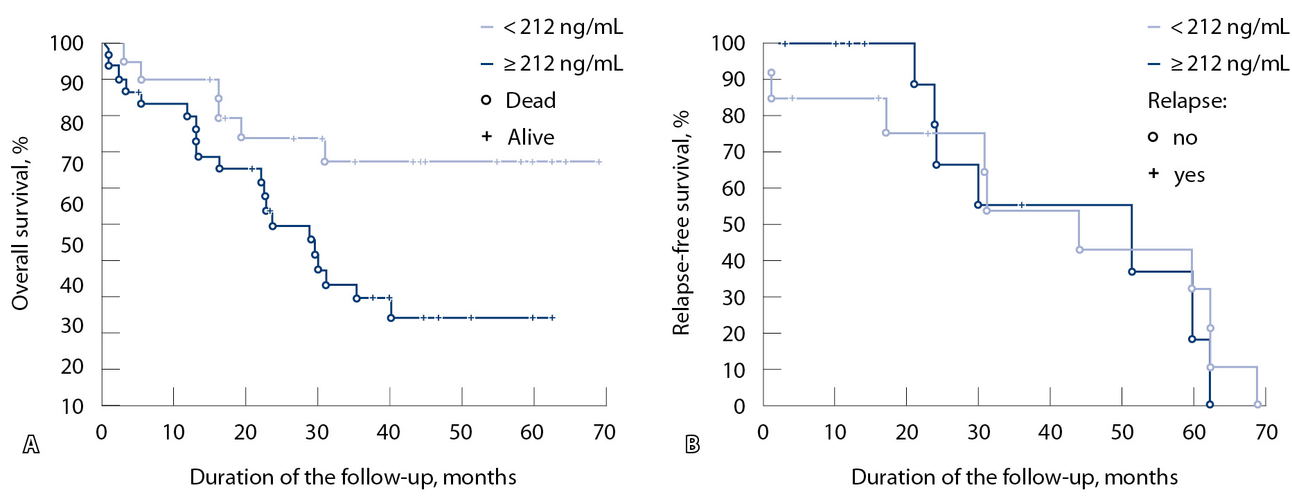 Для оценки влияния уровня галектина-3 на общую и безрецидивную выживаемость больных РЖ при выборе пороговых значений рассматривали концентрации маркера в плазме крови больных РЖ, соответствующие верхнему и нижнему квартилям, а также медиане. Статистически значимых различий общей выживаемости при данных дискриминационных уровнях не отмечено. Наиболее выраженные различия удалось получить при использовании показателя медианы галектина-3 (12,9 нг/мл) (рис. 1А): общая 5-летняя выживаемость в группе пациентов с концентрацией галектина-3 ниже 12,9 нг/мл была выше, чем у больных с более высоким уровнем данного маркера, и превысила 50%. Выживаемость в группе с содержанием маркера более 12,9 нг/мл составила 43% (медиана 30 месяцев), однако различия не достигали уровня статистической значимости (р = 0,59). Как следует из данных рис. 1Б, кривые безрецидивной выживаемости больных РЖ в зависимости от уровня галектина-3 практически не различались (р = 0,52).