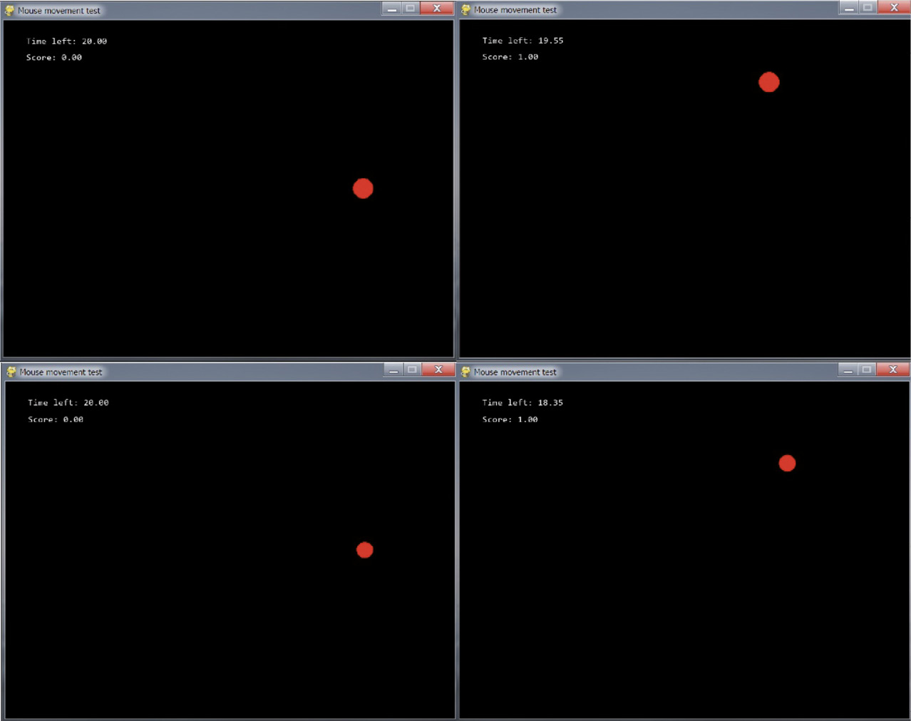 Первой исследовалась доминантная рука испытуемых, после этого тестировалась другая (недоминантная) рука. В ходе опроса было установлено, что у всех участников исследования доминантной была правая рука. Размер окна программы составлял 800 × 600 пикселей и не зависел от параметров монитора компьютерной системы и разрешения экрана, что позволяет стандартизировать получаемые результаты и сделать диагностическую систему более универсальной. Всего каждому из испытуемых давалось по 4 попытки прохождения теста на доминантную и недоминантную руку, каждая попытка ограничивалась 20 секундами. Задача испытуемого – перемещать курсор мыши в окне и наносить клики по объектам (меткам) красного цвета, при этом объекты располагались на условном кольце. При клике по первому объекту он исчезает, и появляется второй объект красного цвета дальше по условному кольцу в направлении против часовой стрелки на определенном расстоянии от первого объекта (рис. 1). В процессе исследования компьютерная кинетическая система регистрировала координаты траектории перемещения курсора, а также число корректных попаданий по меткам и количество промахов. По окончанию исследования на основании этих данных рассчитывалось 13 метрик, характеризующих характер и качество движений, выполняемых испытуемым исследуемой рукой в ходе тестирования.