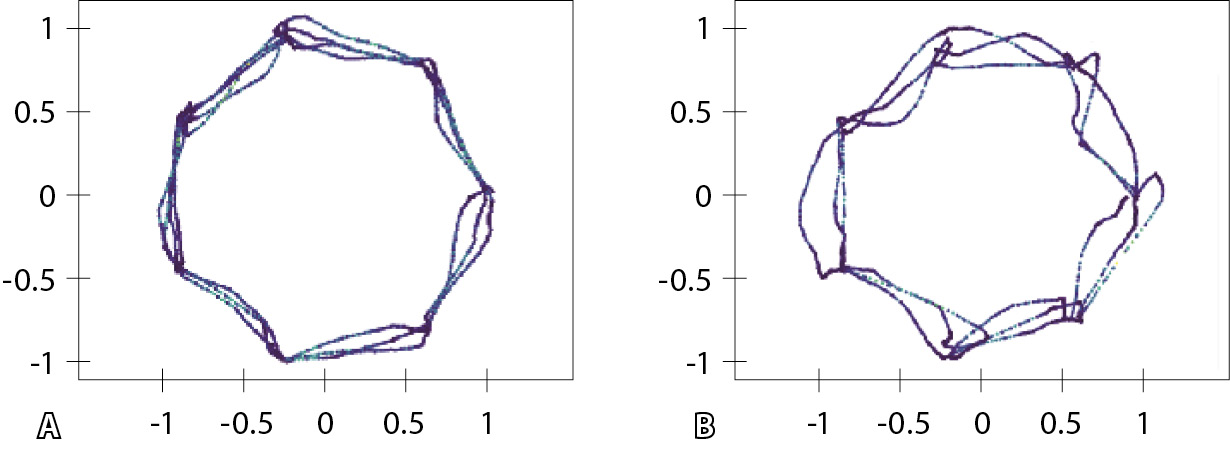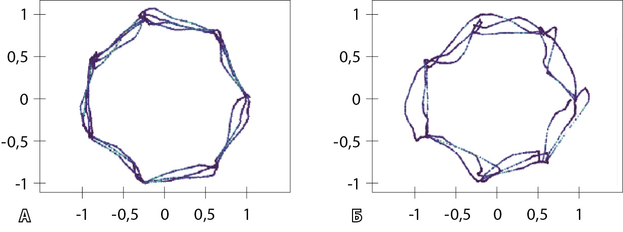 Рис. 2. Траектория выполнения задания: А – здоровым испытуемым, Б – пациентом с рассеянным склерозом