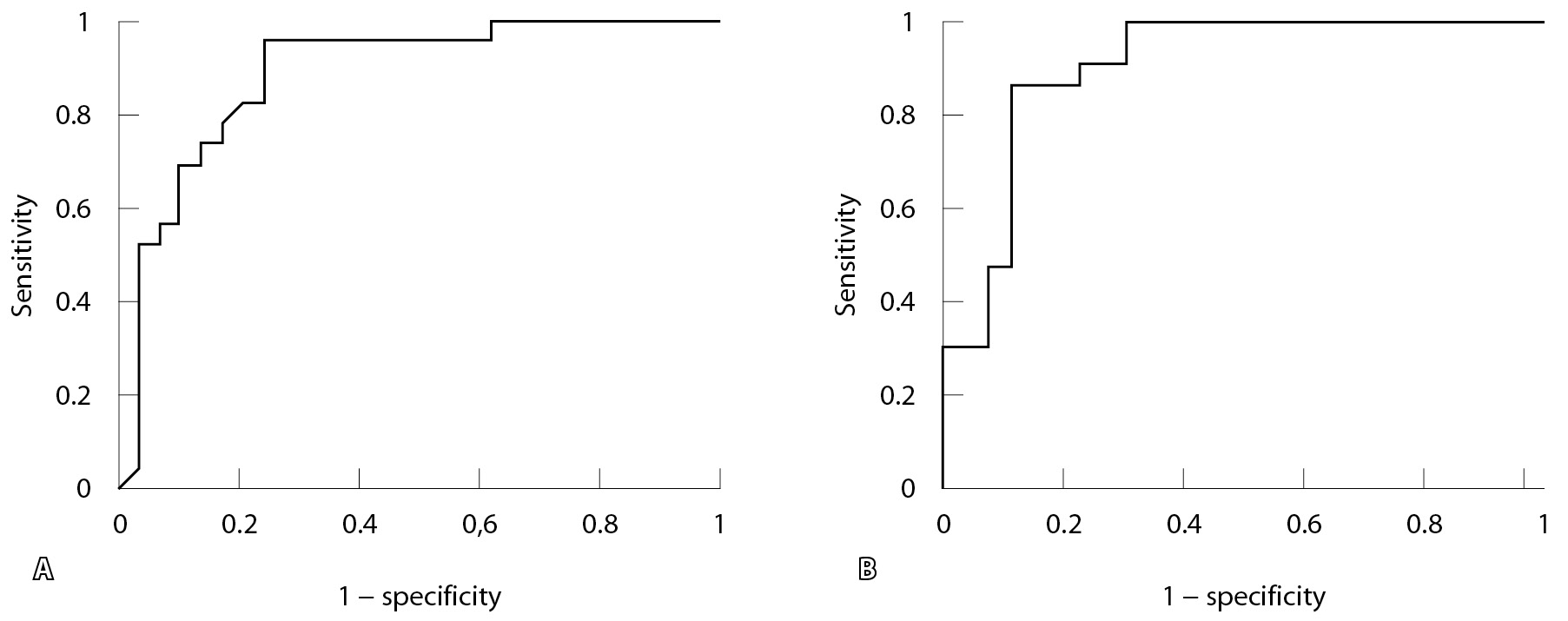 Для проверки качества исследуемого метода был проведен ROC-анализ с построением кривых чувствительности и специфичности. Вычисленная площадь под ROC-кривой составила 0,89 при анализе результатов тестирования доминантной руки и 0,9 при анализе результатов тестирования недоминантной руки, что соответствует отличному качеству исследуемого метода (рис. 3).