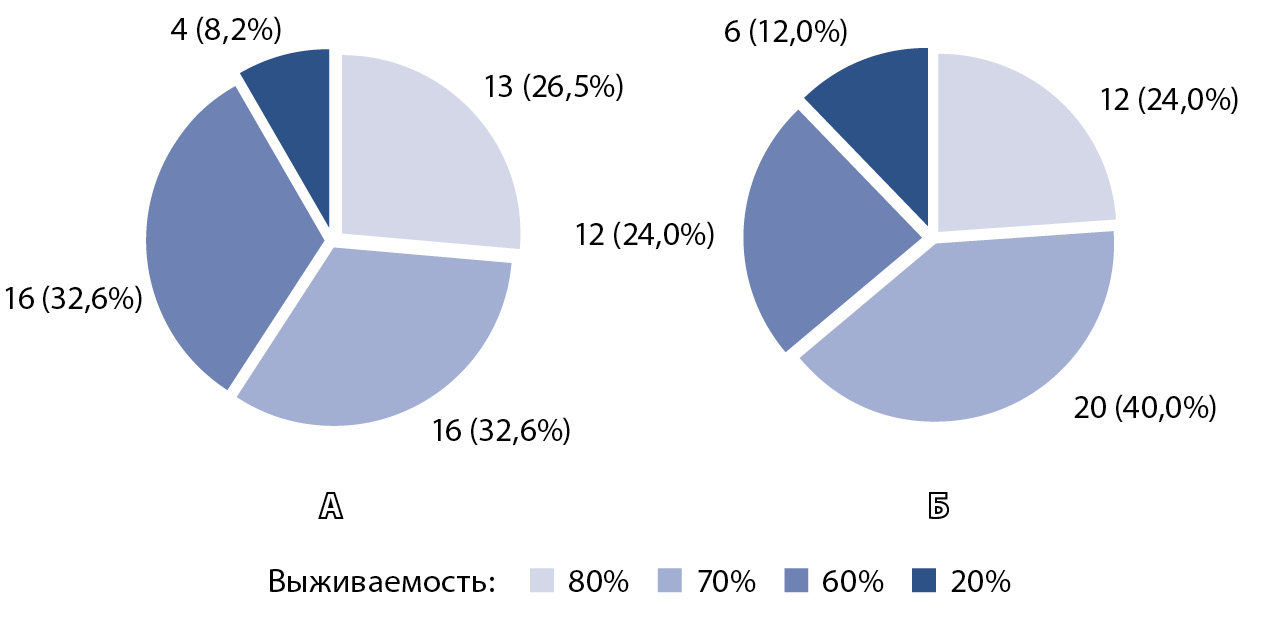 Статистический анализ выполняли с помощью программы IBM SPSS Statistics v.25 (разработчик – IBM Corporation). Количественные показатели оценивались на предмет соответствия нормальному распределению, для чего использовали критерий Шапиро – Уилка (так как количество исследуемых было менее 50), а также показатели асимметрии и эксцесса. В случае описания количественных показателей, имеющих распределение, отличное от нормального, рассчитывали медиану (Mе) и квартили [Q1; Q3]. Номинальные данные описывали с указанием абсолютных значений и процентных долей (%). Для сравнения независимых совокупностей в случаt отсутствия признаков нормального распределения данных использовали U-критерий Манна – Уитни. Статистическая значимость различий количественных показателей, имеющих распределение, отличное от нормального, между 3 и более группами оценивалась при помощи анализа Краскела – Уоллиса. В случае обнаружения статистически значимых различий между группами дополнительно проводили сравнение совокупностей попарно при помощи апостериорного критерия Шеффе. Статистически значимыми считали значения р менее 0,05. Значения коэффициента корреляции ρ интерпретировались в соответствии со шкалой Чеддока.