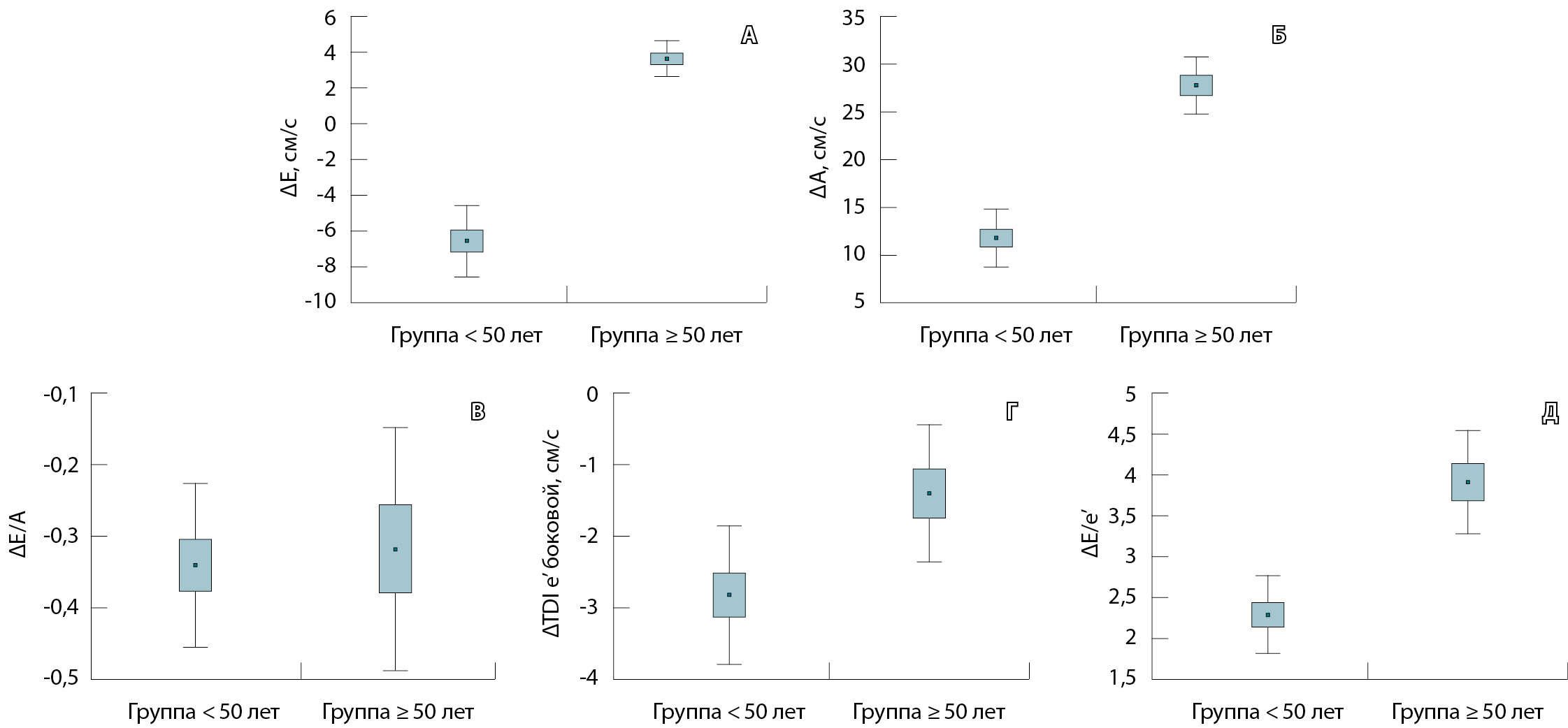 Рис. 1. Динамика показателей, отражающих диастолическую функцию ЛЖ в изученных группах больных (госпитальный период): А – ΔE, cм/с, p = 0,307; Б – ΔА, cм/с, p < 0,023; В – ΔЕ/А, p = 0,212; Г – ΔTDI e’ боковой, см/с, p = 0,014; Д – ΔЕ/e’, p < 0,002