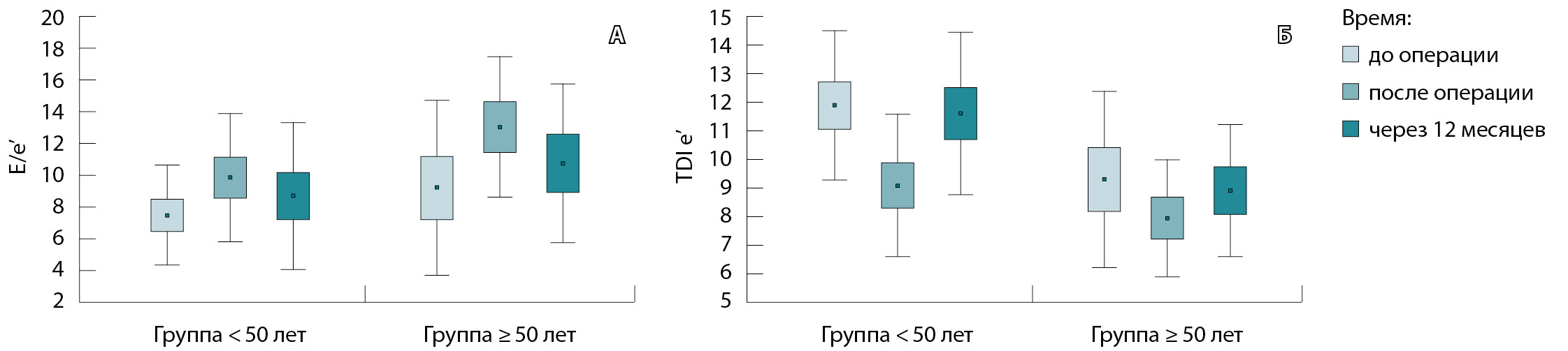 Параметры диастолической функции в отдаленном периоде имели следующую тенденцию: показатель давления наполнения ЛЖ E/e’ снизился в обеих группах по сравнению с ранним послеоперационным периодом и приблизился к исходному до операции (первая группа: 7,6 ± 3,6 → 9,9 ± 4,1 → 8,7 ± 4,8; вторая группа: 9,2 ± 5,7 → 13,1 ± 4,3 → 10,8 ± 5,6). Показатель TDI e’ тоже стал близок к исходным значениям, увеличившись с 9,1 ± 2,2 сразу после операции до 11,6 ± 1,9 через 12 месяцев после операции в первой группе и с 7,9 ± 1,6 до 8,9 ± 2,8 во второй группе соответственно (рис. 2). Доплеровские показатели трансмитрального кровотока во всех группах через год после оперативного лечения имели тенденцию к изменению в направлении исходных значений до операции.