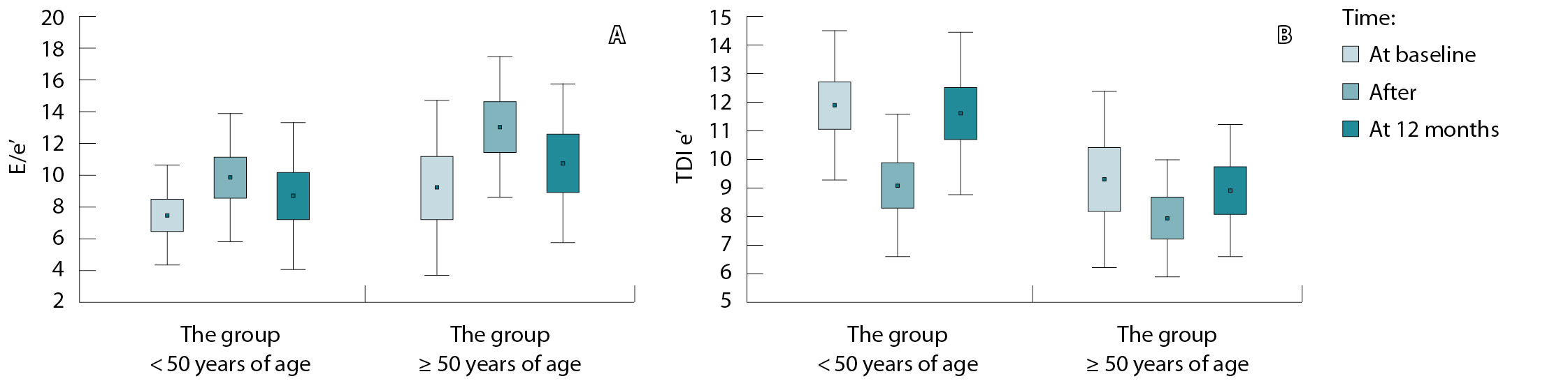 Results: The indexed LA volume at baseline in the second group was slightly higher than in the first one (27.6 ± 9.8 ml/m2 and 25.4 ± 7.1 ml/m2; p = 0.311), whereas there was no between-group difference in the baseline indexed LV volume parameters (41.8 ± 7.9 ml/m2 and 42.4 ± 8.6 ml/m2, respectively; p = 0.768). Immediately after the closure of the ASD, LV diastolic function deteriorated. In the patients below 50 years of age, this difference was non-significant, despite significant changes in the E/e’ values (from 7.6 ± 3.6 to 9.9 ± 4.1; p = 0.012). In the second age group, this parameter increased significantly (from 9.2 ± 5.7 to 13.1 ± 4.3, respectively; p = 0.005). The TDI index (e’ lateral) decreased in both groups: in the group 1, from 11.9 ± 2.5 to 9.1 ± 2.2 (p < 0.001) and in the group 2, from 9.3 ± 3.6 to 7.9 ± 1.6 (p = 0.061). Two patients of the elderly group, in whom sings of LV failure were identified immediately after the defect closure, by echoCG showed the lowest TDI values (е’ lateral) (7.8 and 8.0 cm/sec before closure and 6.4 and 7.0 cm/sec thereafter), as well as the highest values E/e’ before closure (13.4 and 13.1, respectively). In the long-term (12.5 ± 6.5 months on average), the E/e’ index decreased in both age groups, compared to that in the early postoperative period, approaching the preoperative parameters (group < 50 years of age: 7.6 ± 3.6 → 9.9 ± 4.1 → 8.7 ± 4.8, group ≥ 50 years of age, 9.2 ± 5.7 → 13.1 ± 4.3 → 10.8 ± 5.6). The TDI e’ indicators also shifted close to their initial values, increasing from 9.1 ± 2.2 to 11.6 ± 1.9 in the group < 50 years of age and from 7.9 ± 1.6 to 8.9 ± 2.8 in the group ≥ 50 years of age. In the long-term, the LA volume index in both groups was unchanged, compared to its baseline values. The indexed LV end diastolic volume and end diastolic diameter increased significantly at one year after the ASD closure in both groups; however, they did not fall outside the reference ranges, and the LV systolic function indicators remained at the same level.