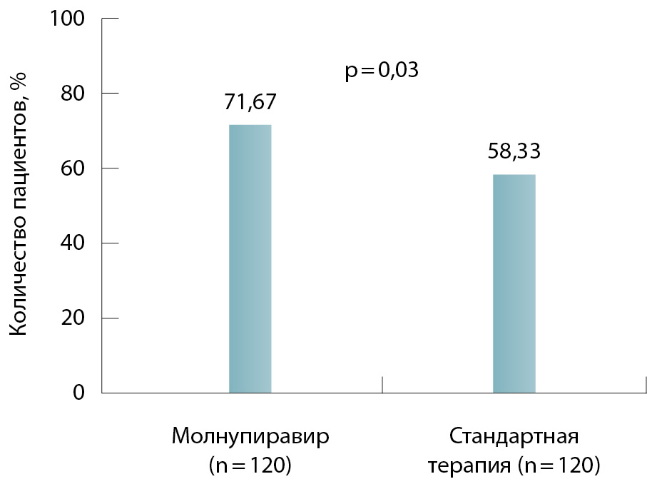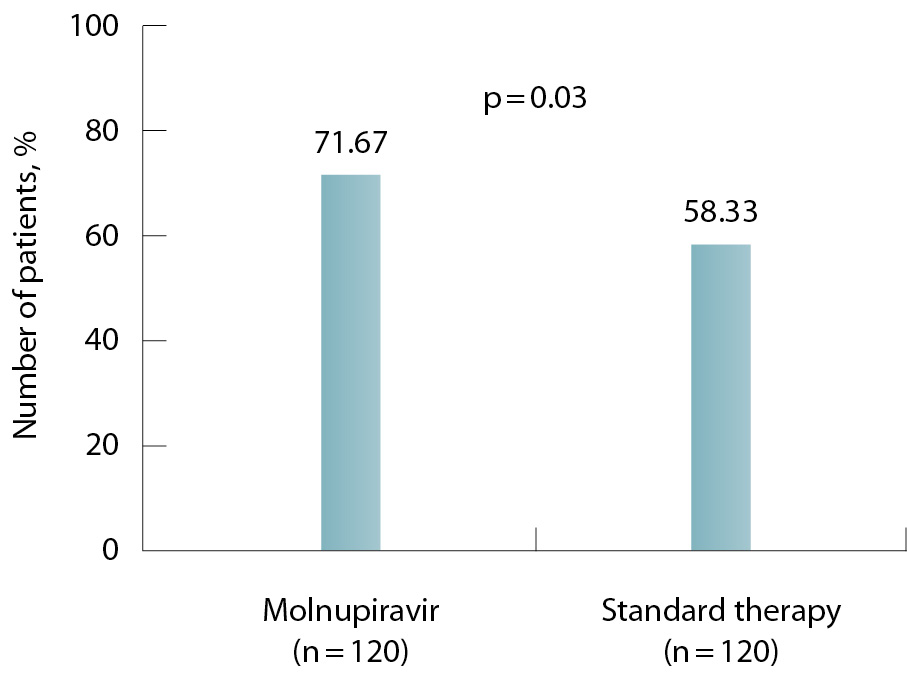 Важным показателем для прогнозирования течения COVID-19 служит скорость элиминации вируса. У 71,7% пациентов, получавших молнупиравир, РНК SARS-CoV-2 в мазке из носоглотки и/или ротоглотки не определялась уже на 6–7-й день от начала терапии, в то время как в группе сравнения такого эффекта удалось достичь лишь у 58,33% больных. У 19,2% (23/120) пациентов из группы молнупиравира к 6–7-му дню удалось достичь полного клинического выздоровления. В группе стандартной терапии излечение к этому моменту было зарегистрировано лишь у 5,8% (7/120).