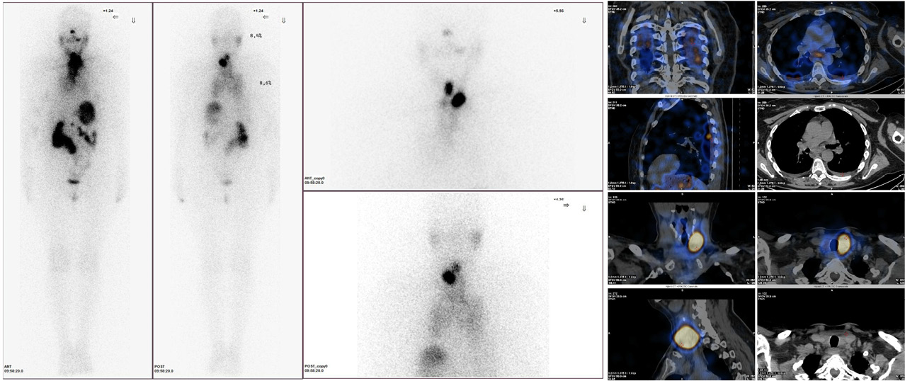 24.06.2022 проведена терапия радиоактивным йодом в дозе 3620 МБк натрия йодида (131I), с предварительным введением человеческого рекомбинантного ТТГ (препарат тиротропин альфа) и последующим возобновлением приема левотироксина натрия в дозе 150 мкг/сут. На посттерапевтических сцинтиграммах в проекции ложа щитовидной железы на фоне диффузного накопления радиофармпрепарата (РФП) вследствие отека мягких тканей шеи и средостения: в проекции средней (по срединной линии) и нижней третей шеи (2 очага – по обе стороны от срединной линии) выявлены 3 прилежащих друг к другу фокуса гиперфиксации РФП высокой интенсивности. Отмечается также диффузная гиперфиксация РФП в проекции задних отделов обоих легких (визуализируется исключительно в задней проекции). Однофотонная эмиссионная компьютерная томография, совмещенная с компьютерной томографией: визуализируются фокусы гиперфиксации РФП – кпереди от щитовидного хряща, паратрахеально справа и слева, соответствующие накоплению РФП в остаточной тиреоидной ткани. Патологического включения РФП в легких и скелете не выявлено (рис. 2).
