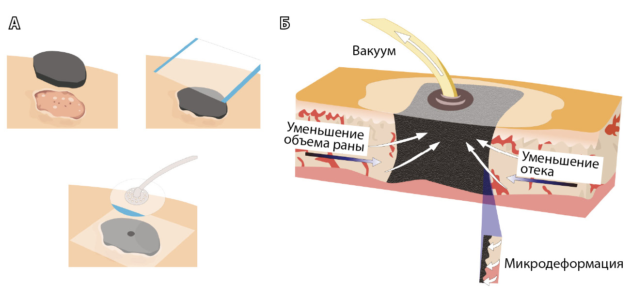 Рис. 1. Схематическое изображение последовательного наложения вакуумной повязки (А): рана заполняется гидрофильной полипропиленовой губкой; герметизация раны адгезивной пленкой и присоединение специальной портативной системы для обеспечения оптимального отрицательного давления и отведения раневого отделяемого; Б – сагиттальный срез, механизм действия отрицательного давления в ране