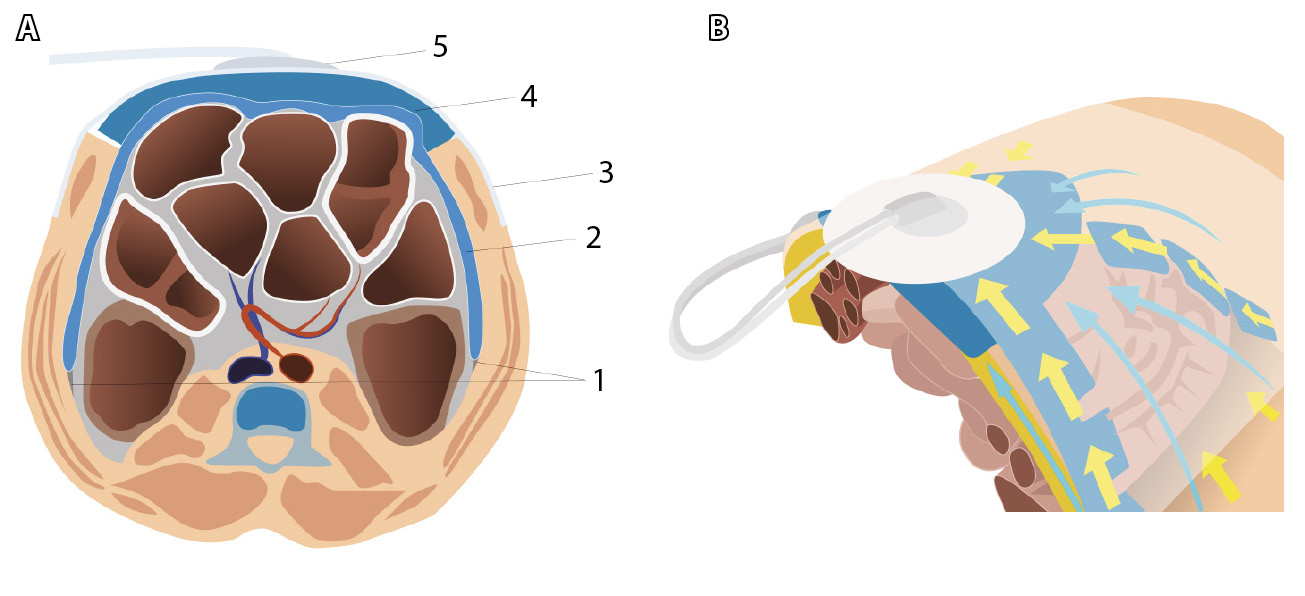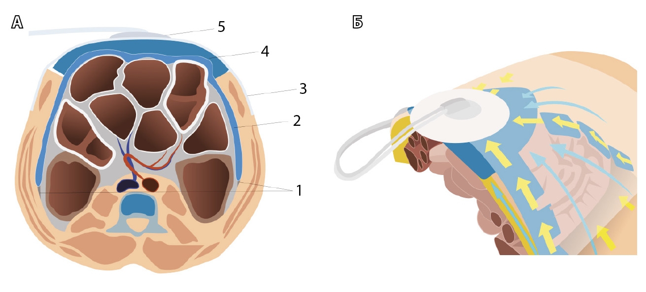 Рис. 2. Способ интраабдоминального применения повязки отрицательного давления (А): 1 – боковые каналы живота, линия Тольда; 2 – неадгезивная пористая пленка изолирует петли кишечника и максимально заведена вдоль боковых каналов по бокам, каудально в полость малого таза и область тазовых сосудов (брюшина вскрыта во время лимфаденэктомии), краниально до верхнего этажа брюшной полости, в том числе изолирована париетальная поверхность печени; 3 – адгезивная герметизирующая пленка для поддержания уровня отрицательного давления в повязке; 4 – полипропиленовая гидрофильная пористая губка для эвакуации экссудата; 5 – портативная система, соединяющая повязку с двухпросветной трубкой: одна половина соединена с контейнером для эвакуации экссудата, вторая – с аппаратом, нагнетающим давление; Б – направление движения экссудата через полипропиленовую пористую губку способствует срединной тракции краев раны, вызывая ее последовательное закрытие