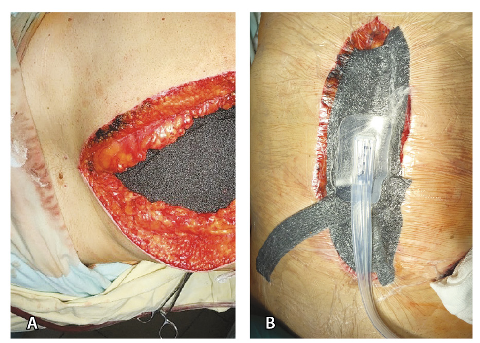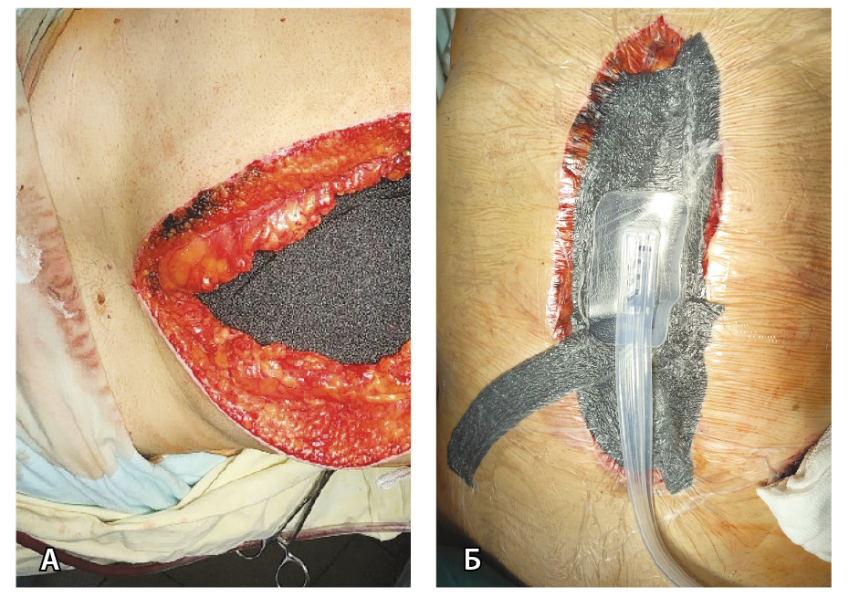 Рис. 3. Пациент К., 11-е сутки после лапароскопической цистэктомии с уродеривацией по Bricker, течение осложнено инфицированной гематомой малого таза с ограниченным гнойно-фибринозным перитонитом. Выполнена лапаротомия, санация очага, установка системы контролируемого отрицательного давления. А – в срединную рану установлена полипропиленовая губка (черного цвета); Б – сверху рана покрыта адгезивной пленкой, в центральную часть раны подключена порт-система, создано отрицательное давление (Р = 100 мм рт. ст.)