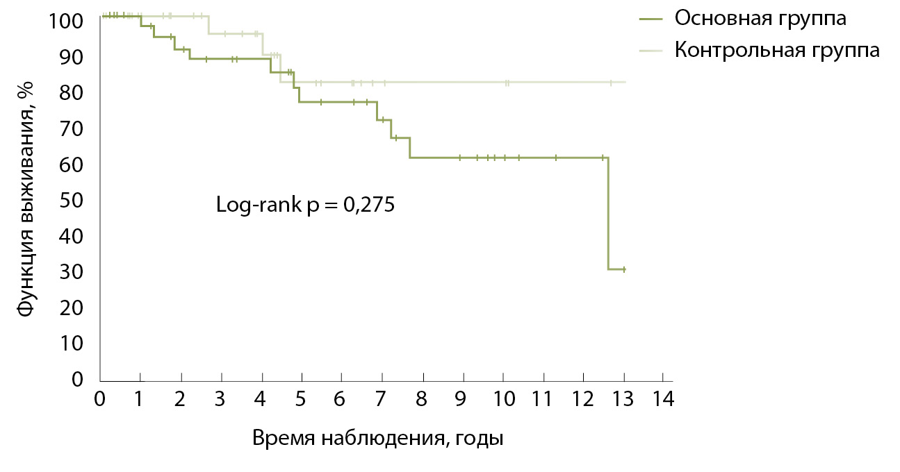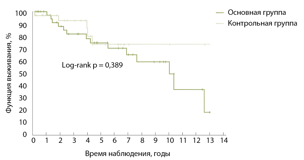 Значимых различий выживаемости без снижения СКФ между основной группой и группой сравнения не наблюдалось, хотя визуально кривые выживаемости основной группы выглядят хуже.