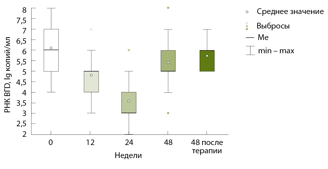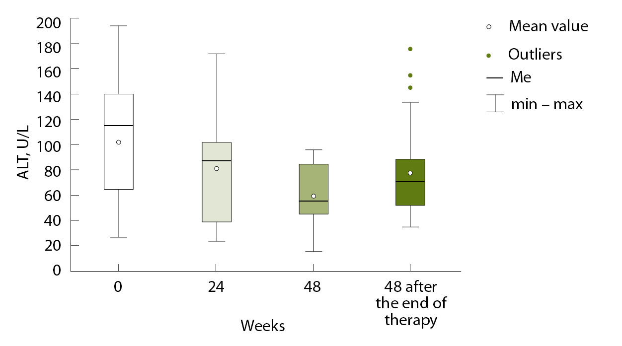 Количественное определение РНК ВГD выполняли до начала терапии, в недели 12, 24 и 48, а также через 48 недель по окончании терапии. Исследование АЛТ выполняли в те же временные точки, кроме 12-й недели терапии. Фиброэластометрию печени проводили до начала терапии, а также на 24 и 48-й ее неделях.