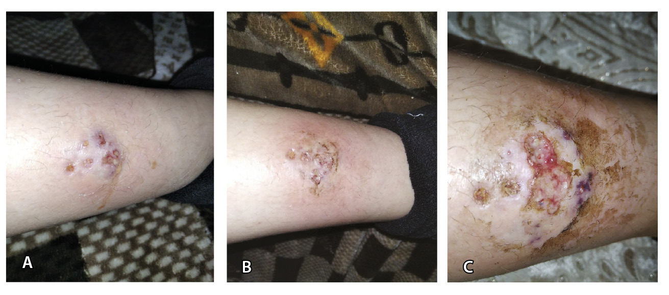 В октябре 2021 г. в средней трети правой голени появилась рана после расчеса, с течением времени развился отек, гиперемия вокруг раны, появились дополнительные свищевые ходы, гнойное отделяемое (рис. 1).