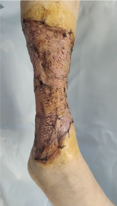 Рис. 4. Состояние после аутодермопластики расщепленными перфорированными трансплантатами (21 ноября 2021 г.)
