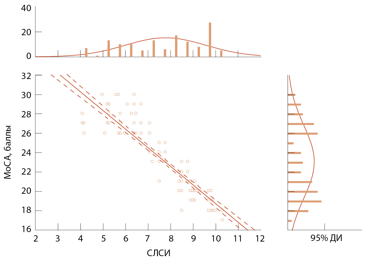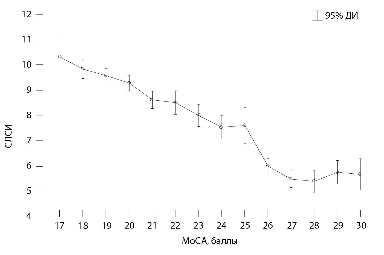 Рис. 1. Линейная регрессионная связь между сердечно-лодыжечным сосудистым индексом (СЛСИ) и баллами Монреальской шкалы оценки когнитивных функций (МоСА); ДИ – доверительный интервал