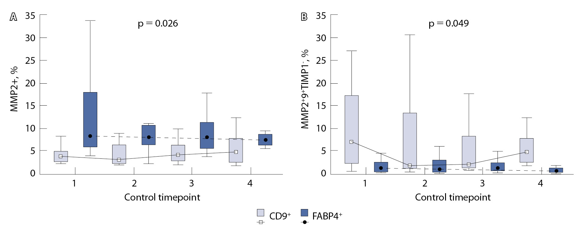 Рис. 3. Экспрессия MMPs и TIMP1 на CD9-позитивных и FABP4-позитивных экзосомах в образцах, взятых у больных раком прямой кишки, в динамике проведения терморадиохимиотерапии (сумма всех исходов); А – сравнение экспрессии субпопуляций MMP2+; Б – сравнение экспрессии субпопуляций MMP2+9+TIMP1-; p – уровень значимости критерия лямбда Уилкса для дискриминантной модели; контрольные точки измерений: 1 – до начала лечения, 2 – в середине курса ТРХТ, 3 – через 6–10 нед. после окончания ТРХТ, 4 – через 6 мес. после точки 1