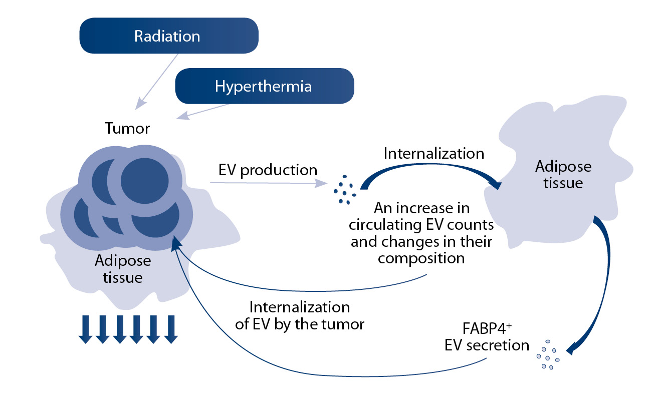 Рис. 4. Схема взаимодействия опухоли и жировой ткани посредством внеклеточных везикул (ВВ) в условиях лучевой терапии и гипертермии; FABP4+ – маркер адипоцитарных ВВ