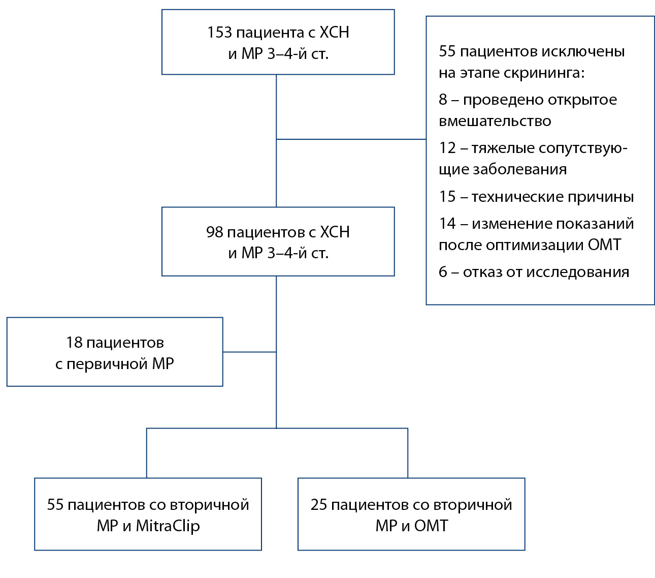 Изначально выполнен скрининг 153 пациентов, поступивших для обследования и лечения в ФГБУ «Национальный медицинский исследовательский центр кардиологии имени академика Е.И. Чазова» Минздрава России (ФГБУ «НМИЦК им. ак. Е.И. Чазова» Минздрава России). После отбора пациентов 73 из них была выполнена транскатетерная пластика МК с использованием устройства MitraClip. Оперативное вмешательство проводилось в условиях рентген-операционной под контролем чреспищеводной эхокардиографии (ЭхоКГ). Суть операции заключалась в том, чтобы максимально близко повторить методику наложения шва по типу «край-в-край», но с применением специальной клипсы, которая, при наложении на створки МК, создает «шов» с двойным отверстием [11]. У 18 пациентов система клипирования створок МК (MitraClip) была установлена по поводу первичной МР. Основную группу исследования составили 55 пациентов со вторичной МР и имплантированными системами клипирования. В группу сравнения вошли 25 пациентов со вторичной МР, которые по разным причинам (отказ от оперативного вмешательства, особенности клапанного аппарата) не подвергались хирургическому лечению МР и получали только ОМТ ХСН. Таким образом, проведен анализ наблюдения 80 пациентов со вторичной МР (рисунок).
