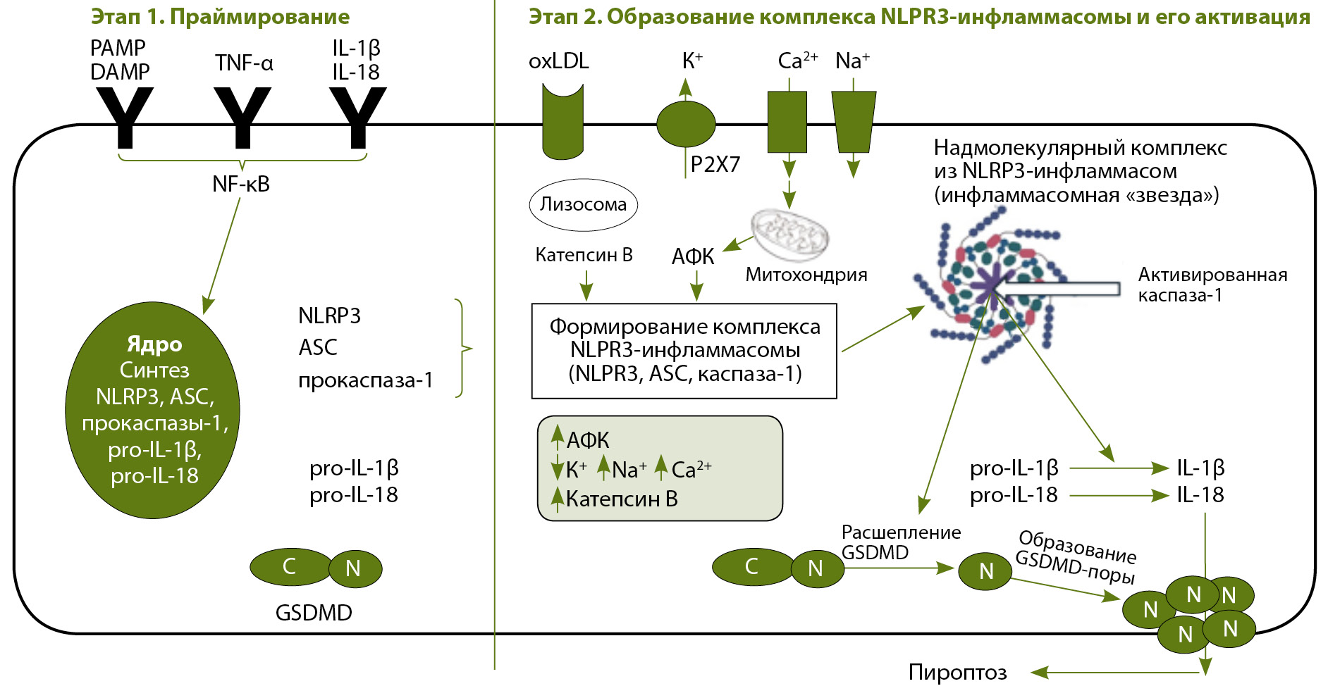 Схема этапов образования и активации комплекса NLPR3-инфламмасомы и запуска пироптоза; ASC – ассоциированный с апотозом Speck-подобный белок, содержащий домен CARD; DAMP – молекулярные структуры, ассоциированные с повреждениями; GSDMD – белок гасдермин D; IL-1β и IL-18 – интерлейкины; NF-κB – ядерный фактор κВ (ключевой транскрипционный фактор); NLRP3 – домен олигомеризации и связывания нуклеотидов (NOD), содержащий богатый лейцином повтор, и пириновый домен (PYD), содержащий протеин 3; oxLDL – окисленные липопротеины низкой плотности; PAMP – молекулярные структуры, ассоциированные с патогенами; P2X7 – пуринергический рецептор; pro-IL-1β и pro-IL-18 – неактивные цитоплазматические предшественники интерлейкинов IL-1β и IL-18; TNF-α – фактор некроза опухоли α; АФК – активные формы кислорода