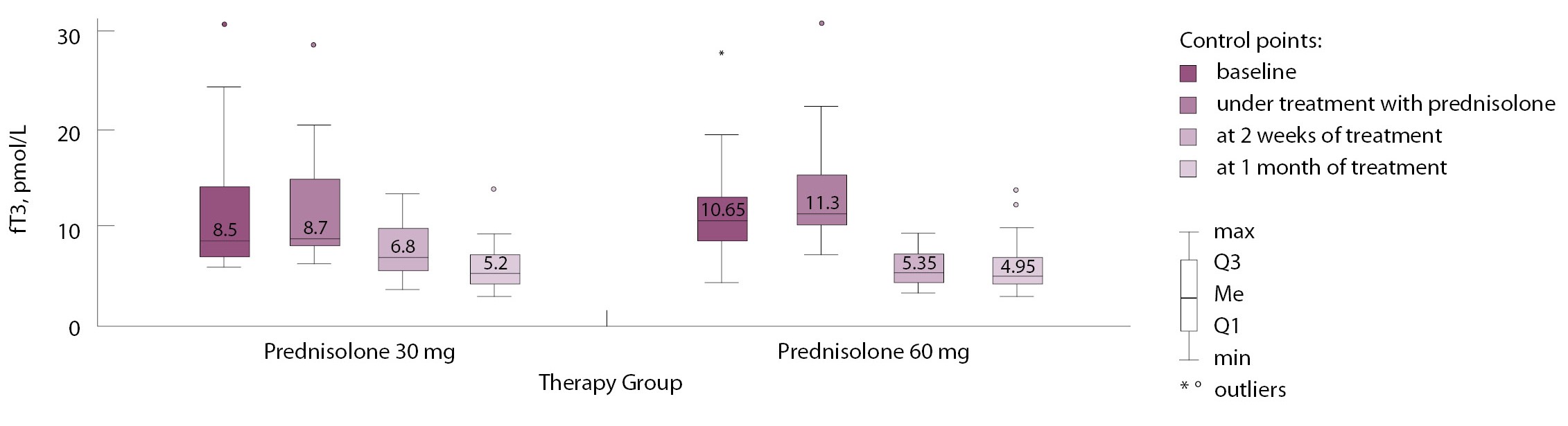 Ремиссия АмИТ2 подразумевала достижение эутиреоза – нормализации сывороточных уровней свТ4, свТ3 с последующим восстановлением референсного значения ТТГ > 0,4 мЕд/л. Повторная волна деструкции регистрировалась при повышении уровня тиреоидных гормонов после предшествующей лабораторно подтвержденной тенденции к их снижению на фоне приема неизмененной стартовой дозы преднизолона. Рецидивом считалось превышение референсного уровня тиреоидных гормонов на фоне снижения дозы преднизолона или после его отмены.