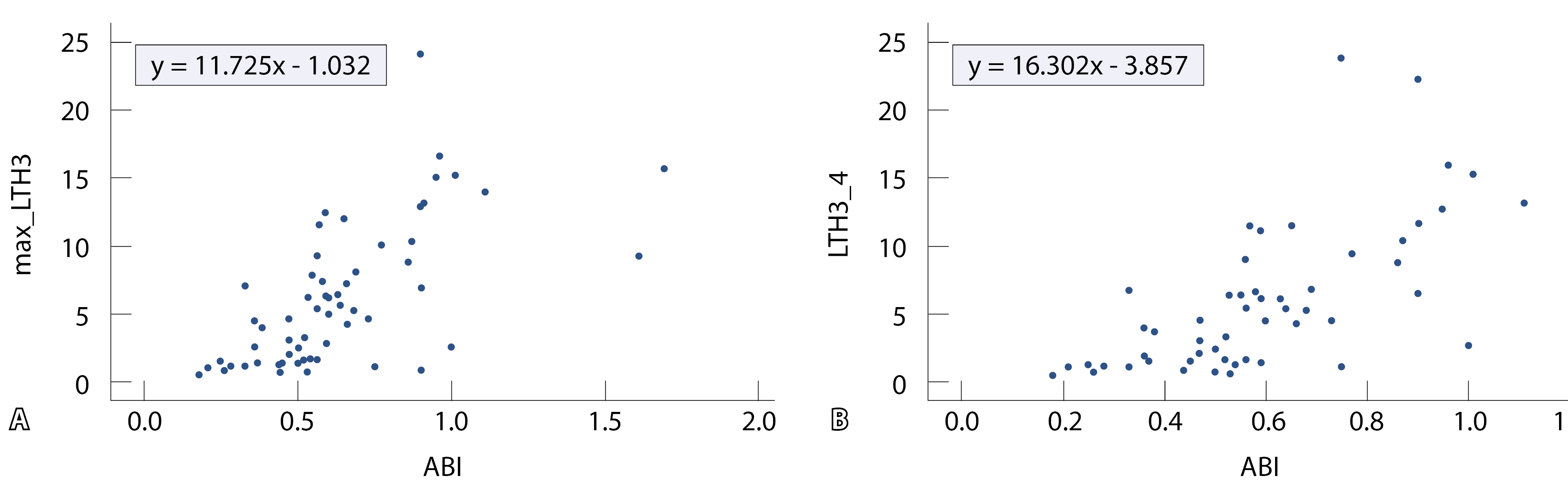 Рис. 2. Диаграммы рассеивания соотношения ЛПИ, max_ЛТГ3 и ЛТГ3_4. ЛПИ – лодыжечно-плечевой индекс; ЛТГ3_4 – локальная тепловая гиперемия на большом пальце стопы на 4-й минуте нагрева (НОФФ); max_ЛТГ3 – максимальная локальная тепловая гиперемия на большом пальце стопы (НОФФ). В рамках указаны уравнения линейной регрессии