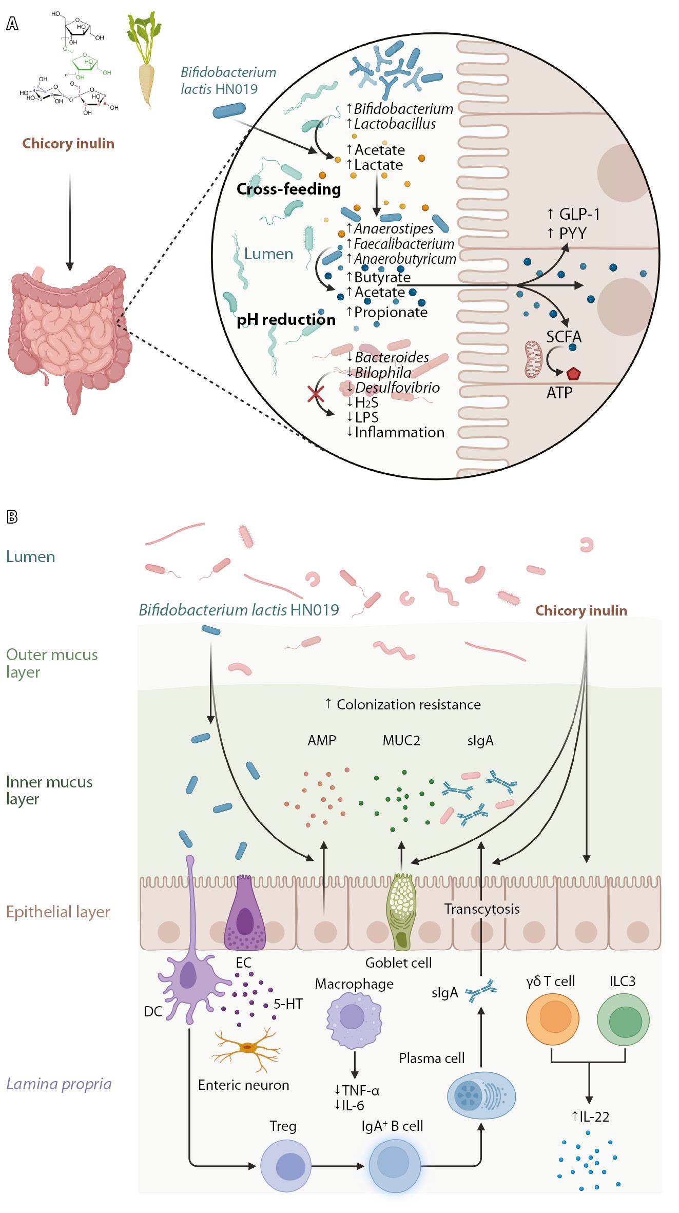 Возможные механизмы действия и полезные эффекты синбиотика на основе пробиотического штамма Bifidobacterium lactis HN019 и инулина из цикория. А – ферментация инулина из цикория микробиотой кишечника с продукцией КЖК. Ферментация инулина в толстой кишке как индигенными бифидобактериями, так и пробиотическим штаммом Bifidobacterium lactis HN019 сопровождается прежде всего снижением внутрипросветного pH, продукцией ацетата и лактата и увеличением численности бифидобактерий (бифидогенный эффект), лактобацилл и бутират-продуцирующих бактерий (Anaerostipes, Faecalibacterium, Anaerobutyricum). Ацетат и лактат используются последними для продукции бутирата в процессе кроссфидинга. Некоторые комменсальные бактерии также продуцируют пропионат при ферментации инулина. Бутират, ацетат и пропионат – основные КЖК, обладающие противовоспалительными, иммуномодулирующими и метаболическими эффектами, регулируют энергетический гомеостаз в колоноцитах (бутират) и способствуют секреции кишечных пептидных гормонов GLP-1 и PYY, улучшая метаболизм глюкозы и снижая резистентность к инсулину. Инулин также уменьшает численность потенциальных патобионтов (Bacteroides, Bilophila, Desulfovibrio), связанных с провоспалительным иммунным ответом и метаболической эндотоксемией, способствуя уменьшению продукции H2S и снижению уровня ЛПС. Bifidobacterium lactis HN019 продуцирует лактат и ацетат, участвуя в кроссфидинге; стимулирует перистальтику кишечника, способствуя биосинтезу серотонина энтерохромаффинными клетками и метаболизму желчных кислот комменсальными бактериями. Б – иммуномодулирующие эффекты инулина и Bifidobacterium lactis HN019. Инулин регулирует дифференциацию и пролиферацию иммунных клеток (в том числе Treg), уменьшая воспаление в кишечнике; повышает экспрессию белков плотных контактов, индуцирует секрецию sIgA и MUC2 плазматическими и бокаловидными клетками и способствует секреции IL-22 γδ-T-клетками и ILC3, поддерживая гомеостаз кишечного барьера. Bifidobacterium lactis HN019 подавляет колонизацию патогенных бактерий, в том числе путем усиления секреции антимикробных пептидов; повышает экспрессию белков плотных контактов и стимулирует секрецию sIgA, укрепляя кишечный барьер; снижает выработку макрофагами цитокинов TNF-α и IL-6, связанных с хроническим воспалением и метаболическими нарушениями; повышает активность NK-клеток, участвующих в поддержании врожденного иммунитета, и усиливает фагоцитарную способность полиморфноядерных лейкоцитов. AMP (antimicrobial peptides) – антимикробные пептиды; DC (dendritic cell) – дендритная клетка; EC (enterochromaffin cell) – энтерохромаффинная клетка; GLP-1 (glucagon-like peptide 1) – глюкагоноподобный пептид 1; H2S – сероводород; IL-6 (interleukin 6) – интерлейкин-6; IL-22 (interleukin 22) – интерлейкин-22; ILC3 (innate lymphoid cell 3) – врожденная лимфоидная клетка 3-го типа; MUC2 (mucin 2) – муцин-2; PYY (peptide YY) – пептид YY; sIgA (secretory immunoglobulin A) – секреторный иммуноглобулин A; TNF-α (tumor necrosis factor α) – фактор некроза опухоли альфа; Treg (regulatory T cell) – регуляторный T-лимфоцит; АТФ – аденозинтрифосфат; КЖК – короткоцепочечные жирные кислоты; ЛПС – липополисахарид; 5-НТ – серотонин (5-гидрокситриптамин). Создано с помощью BioRender.com